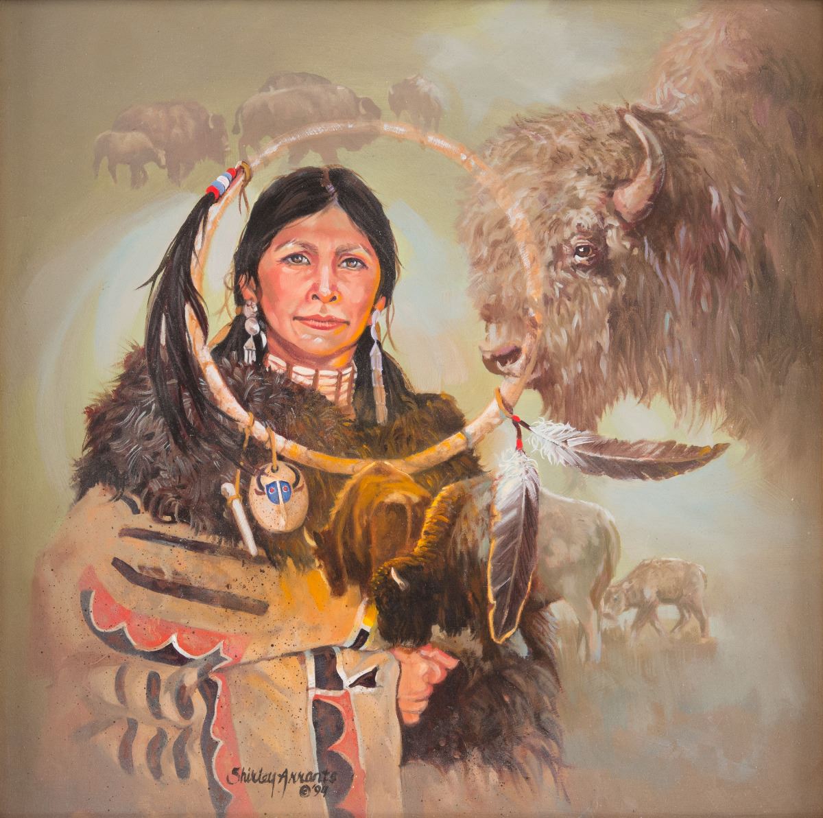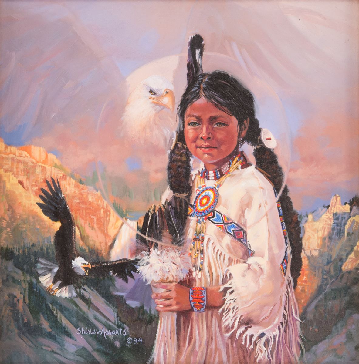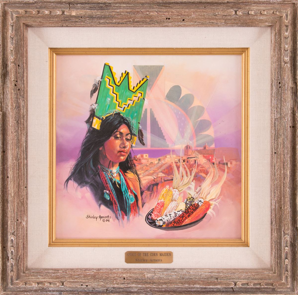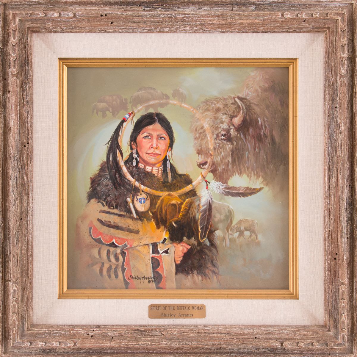 Shirley Arrants (1941 - ). Four oils: 1) Spirit of the High Country. 2) Spirit of the Buffalo Woman. 3) Spirit of the Corn Maiden. 4) Spirit of the Eagle. Each 12" x 12" oil on board. All signed and dated '94 lower left. Verso: Titled and signed. Provenance: From artist's private collection.