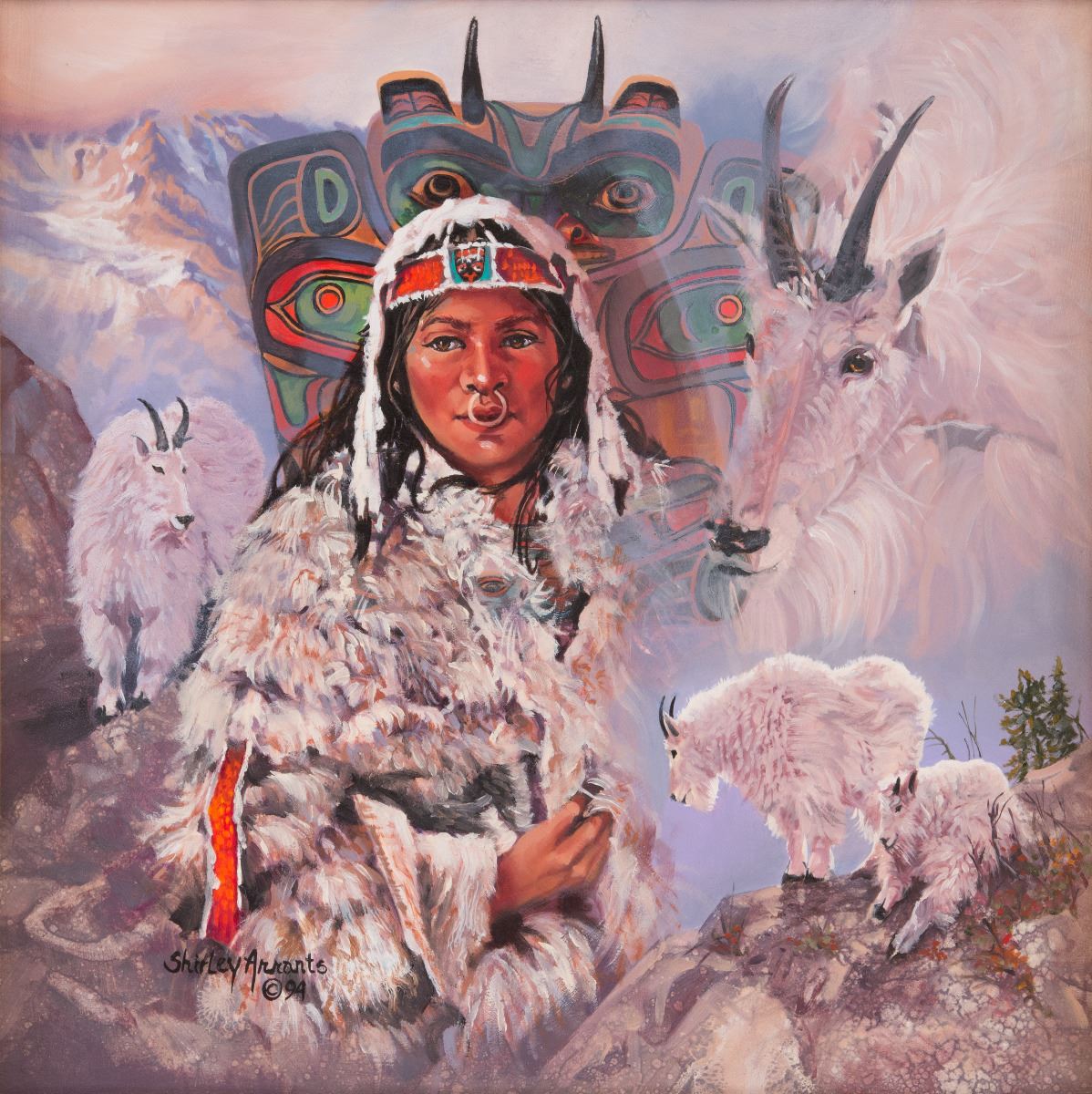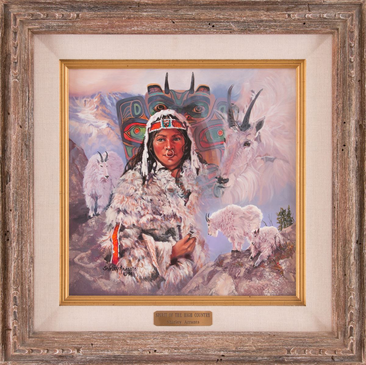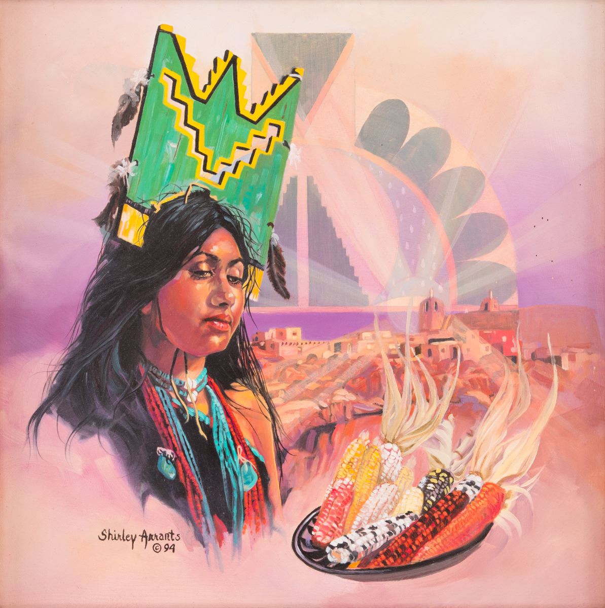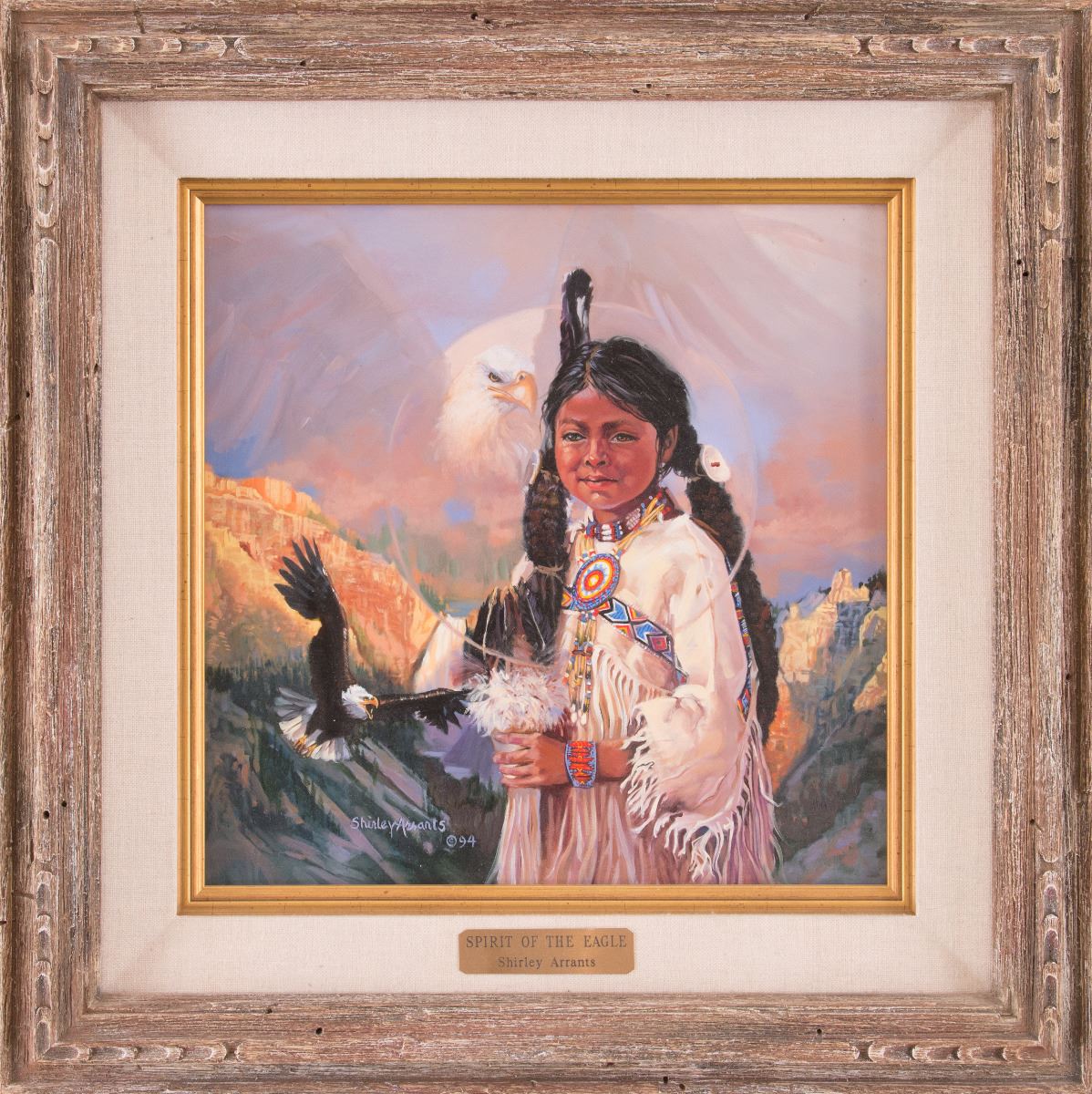 Shirley Arrants (1941 - ). Four oils: 1) Spirit of the High Country. 2) Spirit of the Buffalo Woman. 3) Spirit of the Corn Maiden. 4) Spirit of the Eagle. Each 12" x 12" oil on board. All signed and dated '94 lower left. Verso: Titled and signed. Provenance: From artist's private collection.