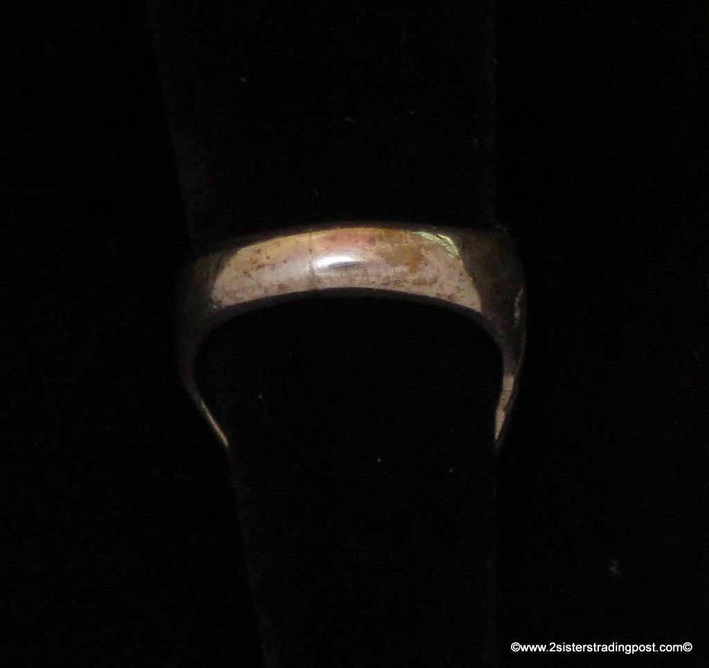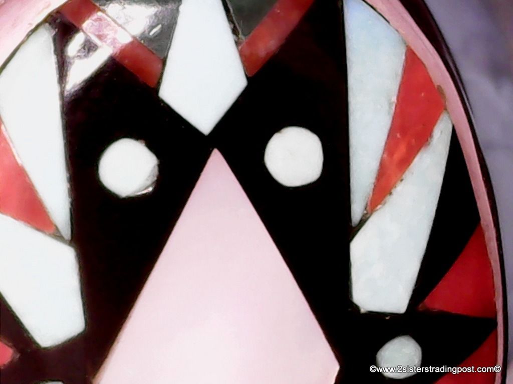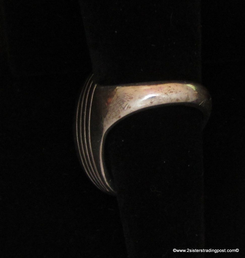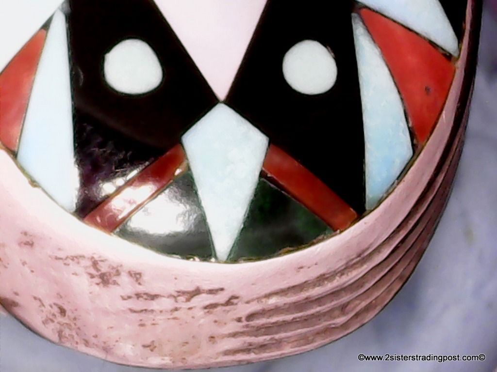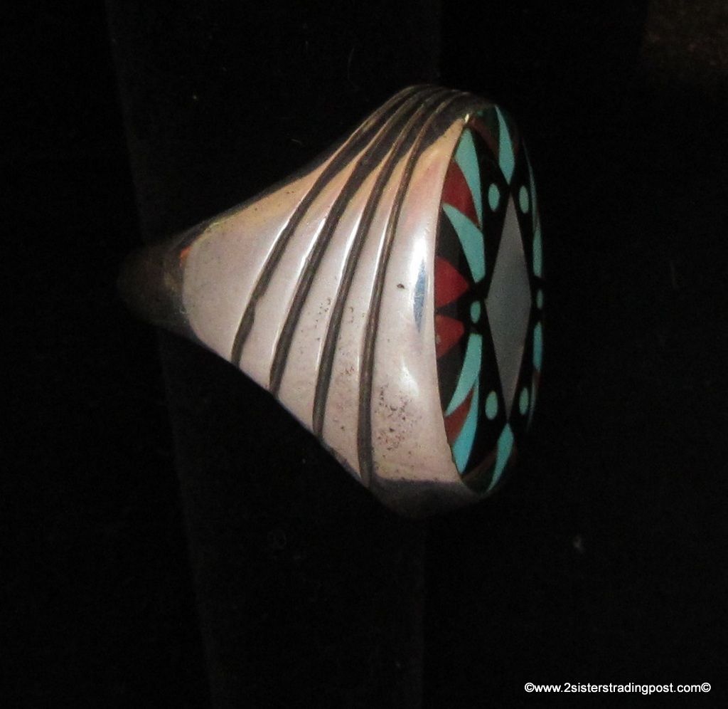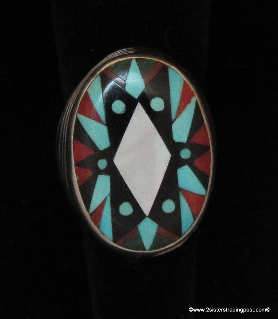 Size 7.75 Zuni oval inlay ring is intricately inlaid with mother-of-pearl, malachite, turquoise, coral and jet. In the center of the oval is a diamond shaped piece of mother-of-pearl surrounded with geometric shapes of malachite, turquoise, coral and jet. The inlay measures 24.4 mm x 17.6 mm and the overall ring measures 27.3 mm x 21.5 mm. The ring weighs 23.2 g and is stamp sterling, S.B. (Shirley Baca's hallmark) and on the other end of the ring is Elliot Qualo's (single stamp deer antler struck twice hallmark)
