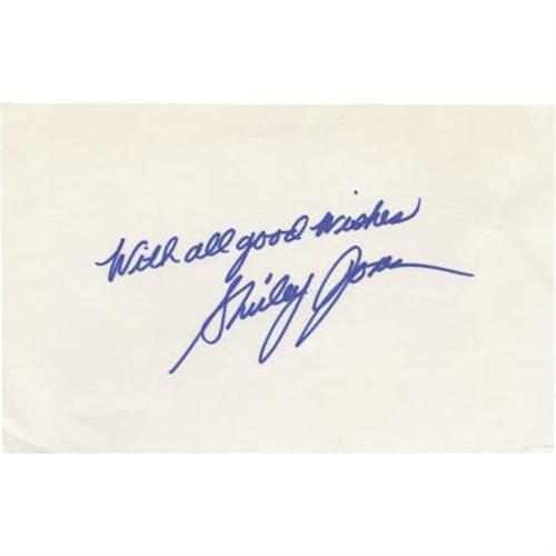 <B>Shirley Jones Autograph.</B></I> An 8" x 5" card autographed by the Academy Award-winning actress (for <I>Elmer Gantry</B></I>) in blue ink. Jones also included her best wishes above her signature. In Excellent condition.<BR><BR><b>Shipping:</b> Flat Material, Small (<a target="_blank" href="http://www.heritageauctions.com/common/shipping.php">view shipping information</a>)