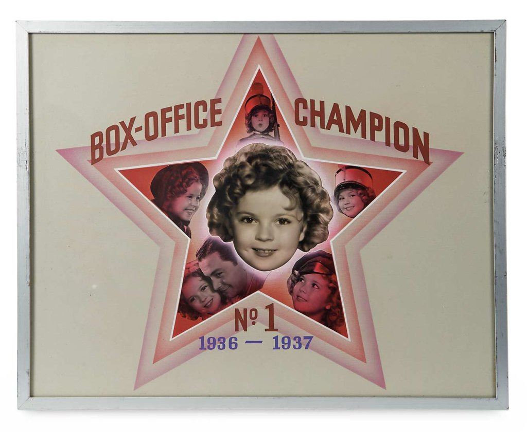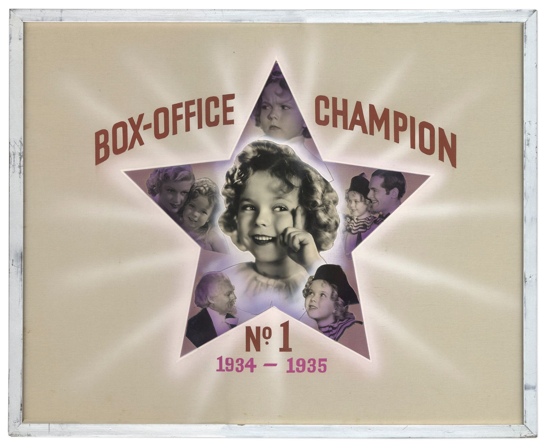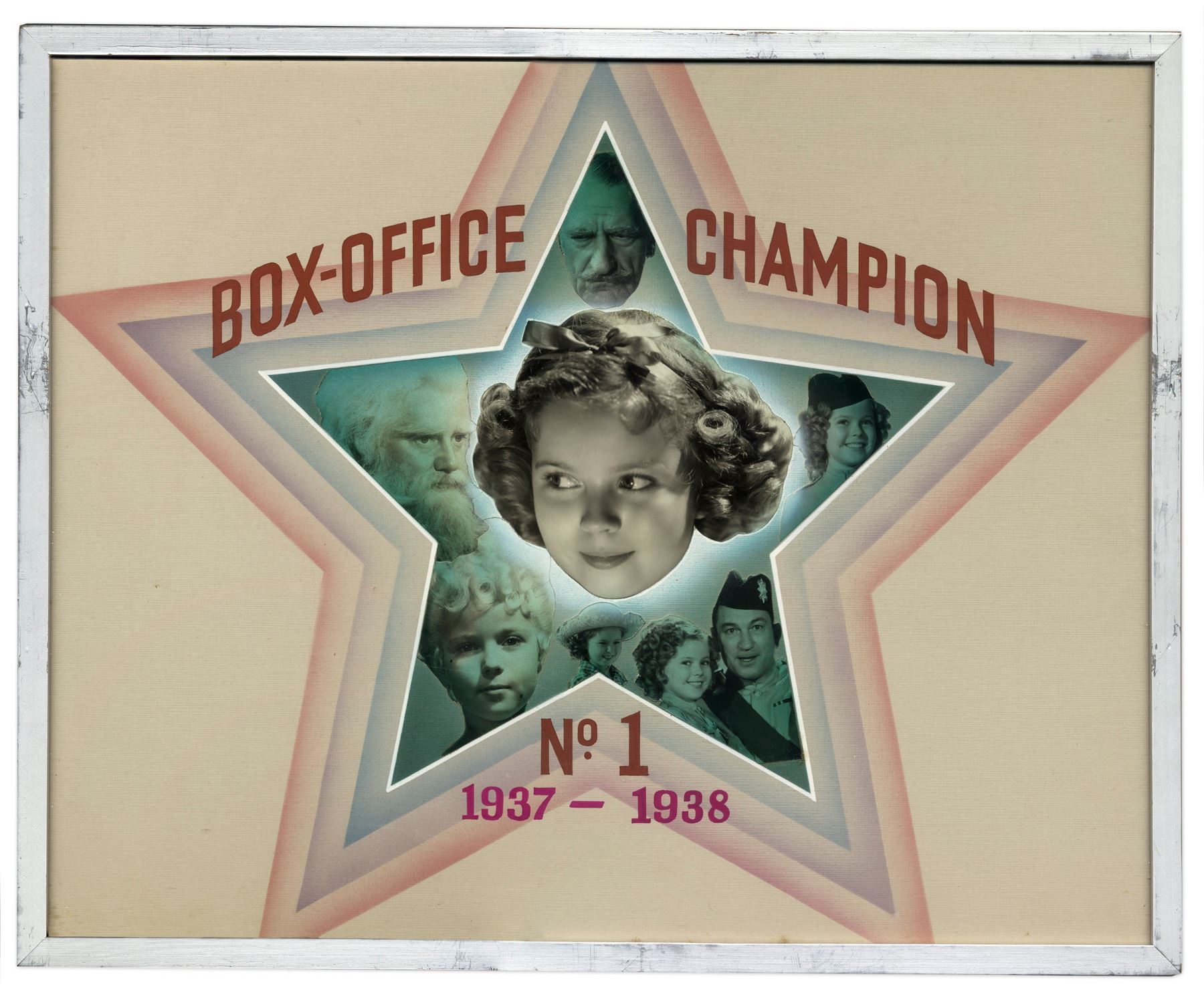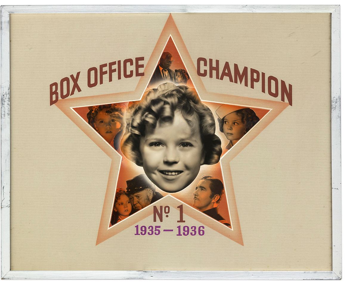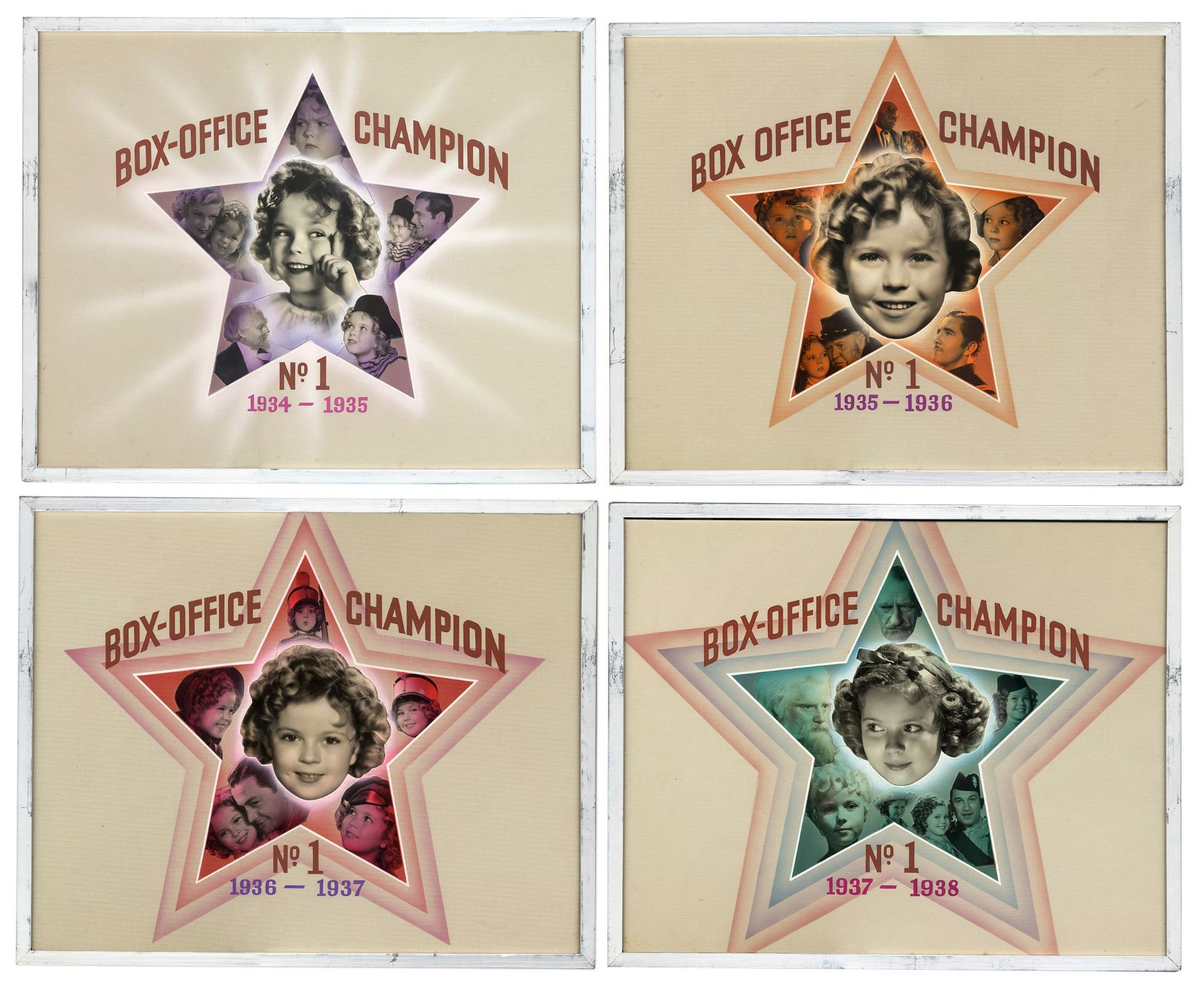 Shirley Temple personally-owned awards, given to her by 20th Century Fox, and based upon the Quigley Publishing Co.'s annual poll of movie theater owners of the most popular movie stars, and also those considered ''box office poison''. Four consecutive #1 awards span from 1934-1938, a feat that has only been equaled by two other stars, Bing Crosby and Burt Reynolds. The poll began in 1932 and continues to this day as one of the most important indicators of a star's box office draw. Awards are centered with a colored star and a montage of photographs symbolizing Shirley's films from the year. An additional star is added each year to indicate her winning-streak, giving her an impressive display for her 1937-1938 award. Award plaques measure 16'' x 19''. Some scratching to frames, otherwise near fine condition. With a COA signed by the Shirley Temple estate.
