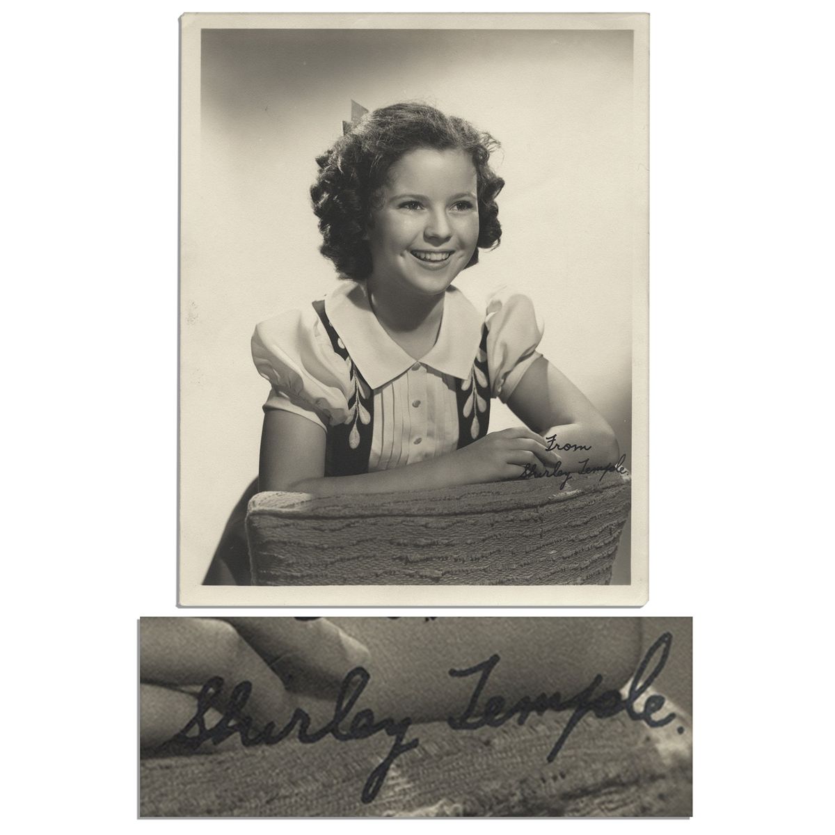 Adorable photo signed, ''From / Shirley Temple'' in bold black ink. Matte image of the smiling star measures 8'' x 10''. Toning, small stain to left edge and tiny adhesive bits to verso, else near fine.