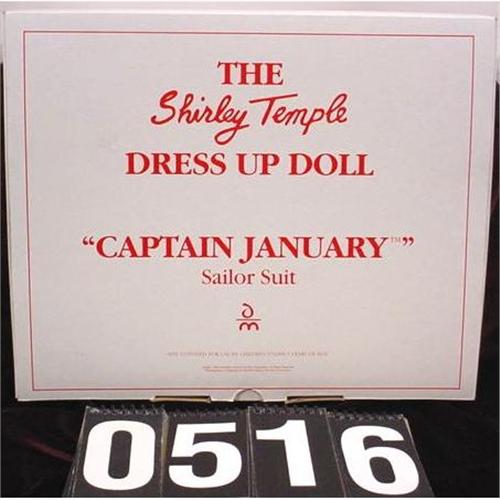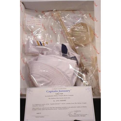 From Danbury Mint, Shirley Temple clothing from the movie Captain January. An authentic replica of Shirley's white sailor suit. In perfect condition. Serial number A4013. Box measures 12" x 10" x 2" and weighs 11 ounces. [81]