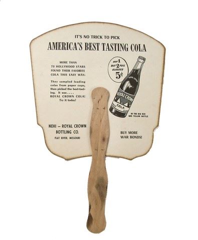 Shirley Temple I'll Be Seeing You Promo Hand-Fan - When director-producer Stanley Kramer was researching his classic masterpiece "Inherit The Wind", about the 1925 Scopes Trail in the South, which was based on the actual transcripts of the infamous "Monkey Trial", he went over copious photographs taken during the event. It took place in the summer, and one image that really struck him was seeing all the participants, reporters and spectators in their suits and heavy dresses, all trying to keep cool with over-sized hand-fans. What made these fans so macabre, was that they were supplied by a local funeral parlor, and their name and logo stood out against the circus atmosphere of the trial. In fact, he incorporated these fans into his own production, even including the funeral parlor sponsorship. Commercial hand-fans were all the rage for years, and the movie industry became its biggest sponsor. Each tried to out due each other with larger and more beautifully displays. To offset the cost, they would usually co-sponsor the fans with pictures of their stars, the name of the film, and another product that the star was promoting. This is a magnificent and extremely rare and beautifully preserved example. It shows a brilliantly colored image of the blossoming 16 year old Shirley Temple, who was making the transition from child super-star to young teen heartthrob. She is holding up a bottle of Royal Crown Cola (known better in the South simply as "RC"), while also promoting her part as Ginger Rogers' sister in the extremely controversial 1944 movie "I'll Be Seeing You". This fan not only has great value because of its virtual mint condition and rarity, but for the movie itself, which was one of the very first "war themed" films that talked openly about soldiers returning home with PTSD (Post-traumatic stress disorder). Made even more intriguing is that it's the "love story" between this solider (played by Joseph Cotton), and Ginger Rogers who is on a special Christmas Furlough from prison! And of course having lost the legendary Shirley Temple this year makes it extremely collectable. One side of this amazing movie fan memorabilia has Shirley Temple with the RC, and the other has a straight ad for Royal Crown Cola, with of course a pitch to "Buy War Bonds". Fan with handle is 12"x8".