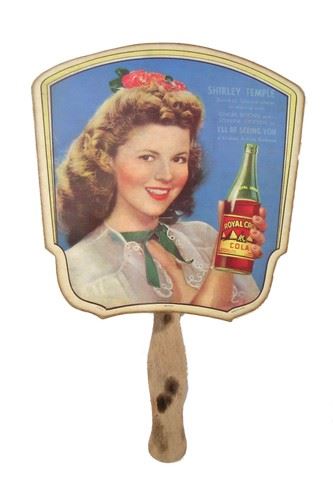 Shirley Temple I'll Be Seeing You Promo Hand-Fan - When director-producer Stanley Kramer was researching his classic masterpiece "Inherit The Wind", about the 1925 Scopes Trail in the South, which was based on the actual transcripts of the infamous "Monkey Trial", he went over copious photographs taken during the event. It took place in the summer, and one image that really struck him was seeing all the participants, reporters and spectators in their suits and heavy dresses, all trying to keep cool with over-sized hand-fans. What made these fans so macabre, was that they were supplied by a local funeral parlor, and their name and logo stood out against the circus atmosphere of the trial. In fact, he incorporated these fans into his own production, even including the funeral parlor sponsorship. Commercial hand-fans were all the rage for years, and the movie industry became its biggest sponsor. Each tried to out due each other with larger and more beautifully displays. To offset the cost, they would usually co-sponsor the fans with pictures of their stars, the name of the film, and another product that the star was promoting. This is a magnificent and extremely rare and beautifully preserved example. It shows a brilliantly colored image of the blossoming 16 year old Shirley Temple, who was making the transition from child super-star to young teen heartthrob. She is holding up a bottle of Royal Crown Cola (known better in the South simply as "RC"), while also promoting her part as Ginger Rogers' sister in the extremely controversial 1944 movie "I'll Be Seeing You". This fan not only has great value because of its virtual mint condition and rarity, but for the movie itself, which was one of the very first "war themed" films that talked openly about soldiers returning home with PTSD (Post-traumatic stress disorder). Made even more intriguing is that it's the "love story" between this solider (played by Joseph Cotton), and Ginger Rogers who is on a special Christmas Furlough from prison! And of course having lost the legendary Shirley Temple this year makes it extremely collectable. One side of this amazing movie fan memorabilia has Shirley Temple with the RC, and the other has a straight ad for Royal Crown Cola, with of course a pitch to "Buy War Bonds". Fan with handle is 12"x8".