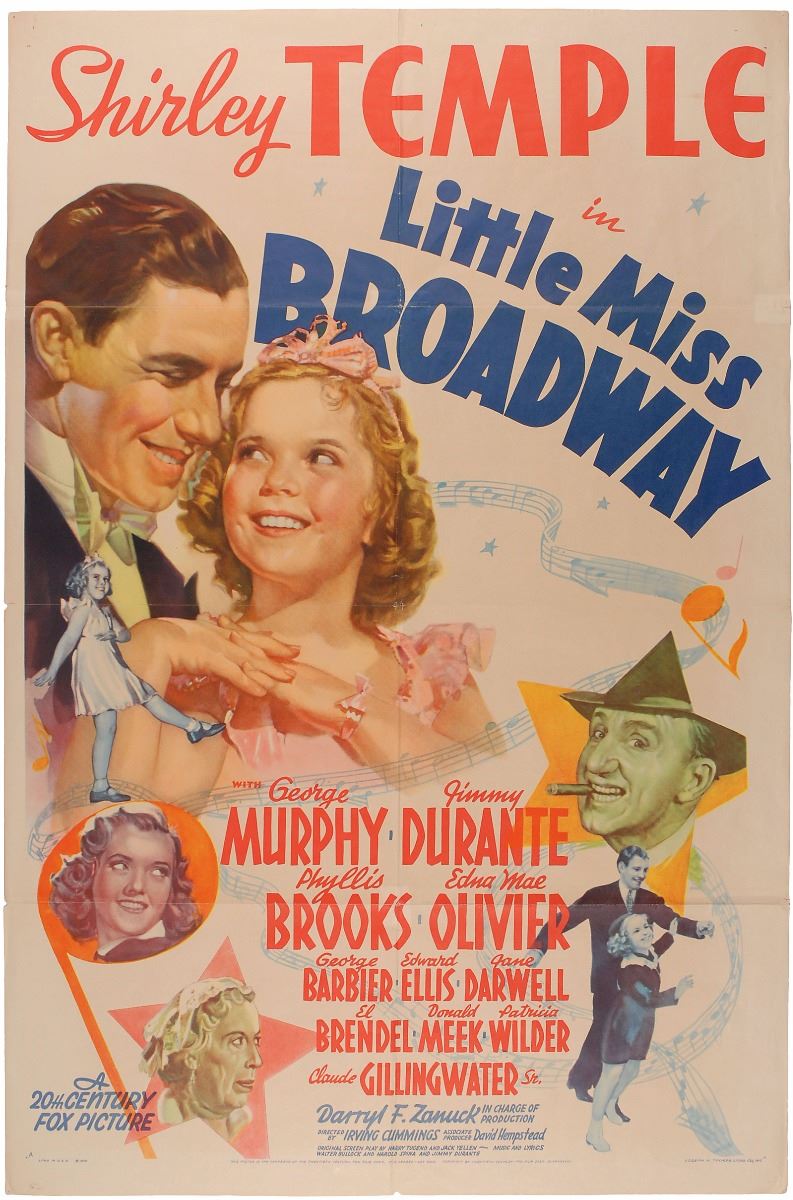 Little Miss Broadway (20th Century Fox, 1938). One sheet movie poster (27 x 41). Musical drama starring Shirley Temple, Edna May Oliver, George Murphy, and Phyllis Brooks in a story about a theatrical boarding house and its occupants. In fine condition, with small tape-repaired edge separations at folds and tiny tack holes to corners. A delightful and uncommon one sheet example.