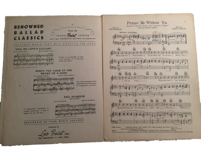 Shirley Temple Sheet Music: Dimples (1936), On The Good Ship Lollipop (1934), Picture Me Without You, set of two. (12x9)