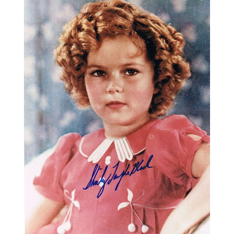 This autographed photo by Temple measures 10" x 8". The photograph shows the young actress with curled red hair in a pretty red dress.
