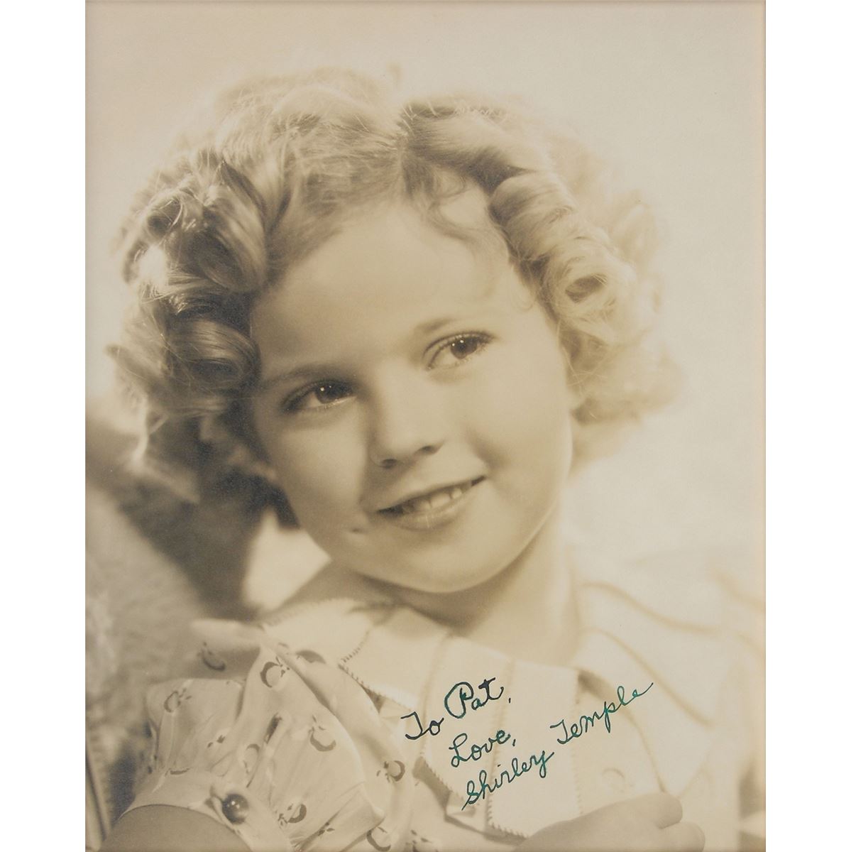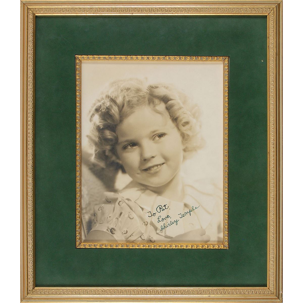 Adorable vintage matte-finish 7 x 9 portrait of a young Temple with her trademark ringlets, boldly signed and inscribed in green fountain pen, “To Pat, Love, Shirley Temple.” Intricately suede-matted and framed to an overall size of 13 x 15. In fine condition. A pristine image of the beloved child star. The James Collings Collection.