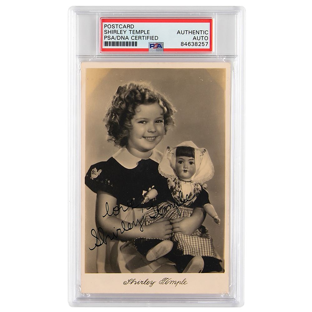 Fantastic vintage matte-finish 3.5 x 5.5 photo of the adorable child star holding a doll, nicely signed in fountain pen, "love, Shirley Temple." In fine condition. Encapsulated in a PSA/DNA authentication holder.