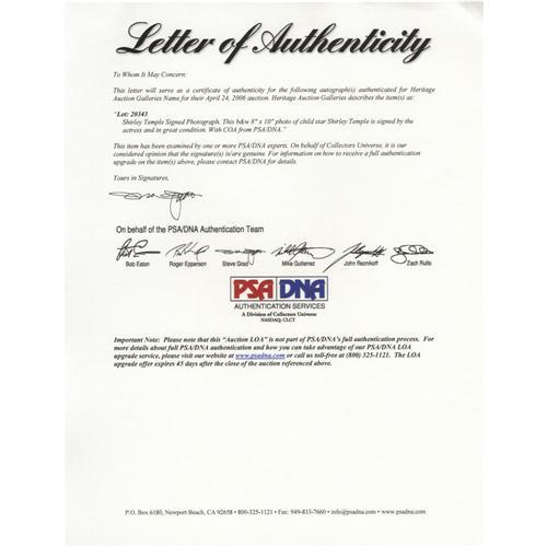 <B>Shirley Temple Signed Photograph.</B></I> This b&w 8" x 10" photo of child star Shirley Temple is signed by the actress and in great condition. <I>With COA from PSA/DNA.</B></I><BR><BR><b>Shipping:</b> Flat Material, Small (<a target="_blank" href="http://www.heritageauctions.com/common/shipping.php">view shipping information</a>)