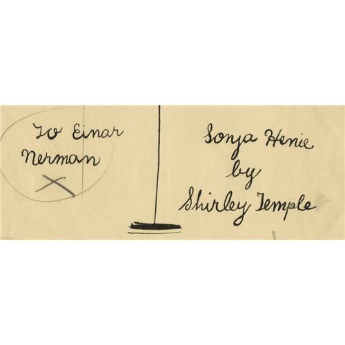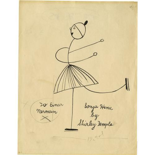 <B>Shirley Temple Signed Sketch of Sonya Henie.</B></I> A stick figure sketch of figure skater Sonya Henie, drawn and signed by Shirley Temple in black ink on white paper. Matted and framed to an overall size of 14.5" x 17.5", and in Very Fine to Excellent condition with mild tanning and some very minor soiling.<I>Accompanied by LOA from PSA/DNA.</B></I><BR><BR><b>Shipping:</b> Framed (<a target="_blank" href="http://www.heritageauctions.com/common/shipping.php">view shipping information</a>)