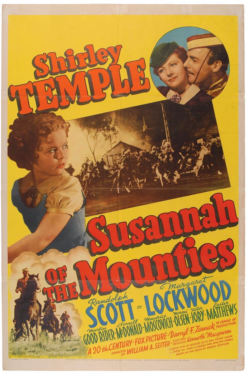 Susannah of the Mounties (20th Century Fox, 1939). One sheet movie poster (27 x 41). Drama starring Shirley Temple, Randolph Scott, and Margaret Lockwood in which Temple plays an orphaned survivor of an Indian attack who is taken in by a Mountie. In fine condition, with small tape-repaired edge separations at folds and tack holes to corners and borders.