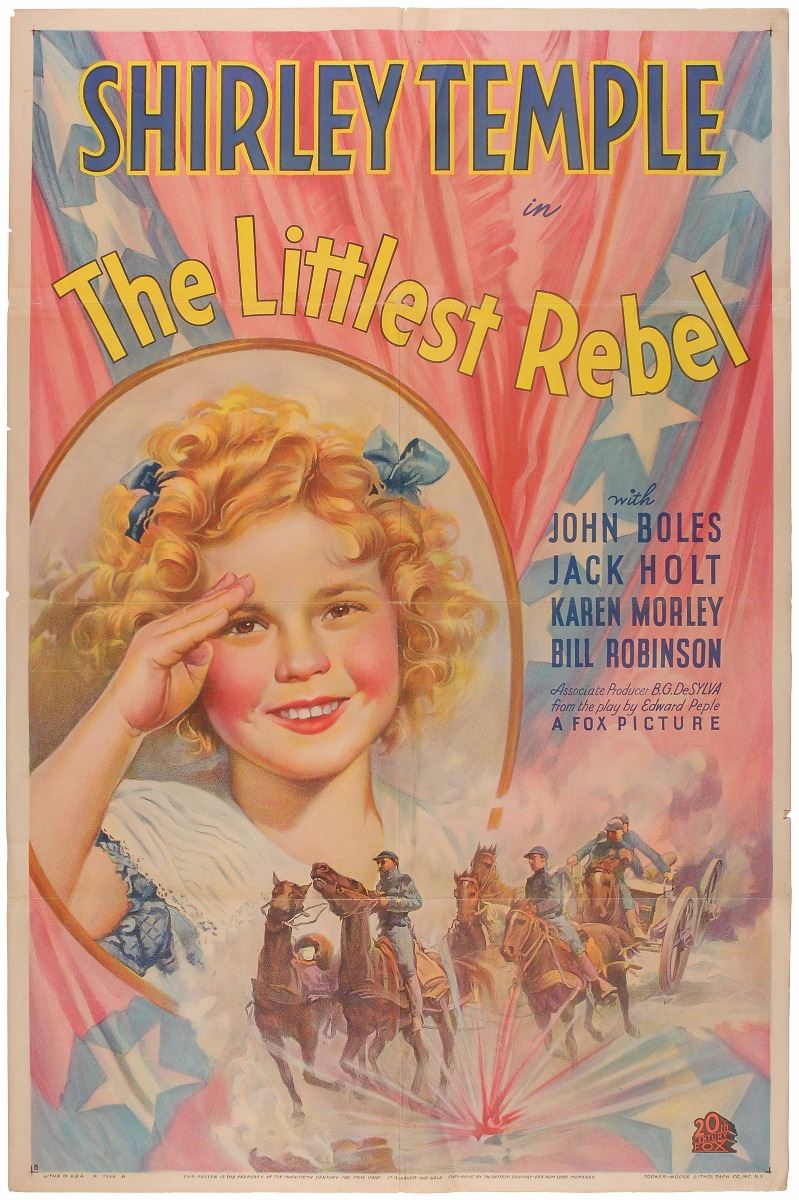 The Littlest Rebel (20th Century Fox, 1935). One sheet movie poster (27 x 41) Style B. Classic drama starring Shirley Temple, John Boles, Jack Holt, and Bill Robinson in a story about a plantation-owning family during the Civil War. In fine condition, with small tape-repaired edge tears and separations, some trivial chipping to edges, and miniscule tack holes to upper corners; none of these affecting the absolutely gorgeous, brilliant coloring. The film was listed as one of the top box office draws of 1935 by Variety and remains one of Temple’s popular films today.