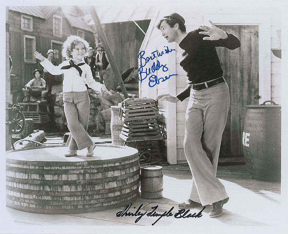 Glossy 10 x 8 photo of the pair dancing in the 1936 film Captain January, signed in black felt tip, “Shirley Temple Black,” and in blue felt tip, “Best wishes, Buddy Ebsen.” In fine condition.