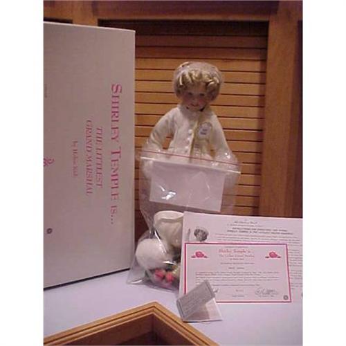 This 13" doll was produced by the Danbury Mint in 2001. She has a well packed cloth torso and her head, arms and legs are bisque. She has all her accessories and certificate. The doll was designed by Helen Kish for the Danbury Mint. I had to unwrap her bisque parts for the first time for the picture. She had been stored away in her box wrapped as she was shipped for the last 5 years. Sold new for lots more than I have on her.All the Danbury Mint Shirleys come with their own stand and box. This one is mint all the way.