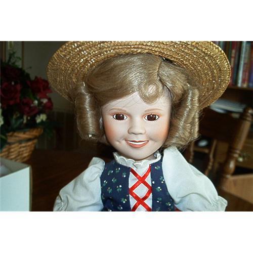 Lovely, Shirley Temple doll issued by the Danbury Mint. Her name is HEIDI. Porcelain Head, Arms, and legs. Correspondence still inside the box. Certificate states: SHIRLEY TEMPLE-DOLLS OF THE SILVER SCREEN.Serial #A6984. She is dressed in a white, blue, and red dress, with red ribbons down the bodice and around her waist. She also has a green stripped apron. Also, wearing a straw hat with a red ribbon around it. Brown shoes with laces. She is still in excellent condition, along with the original box and tissue. Stand also included.