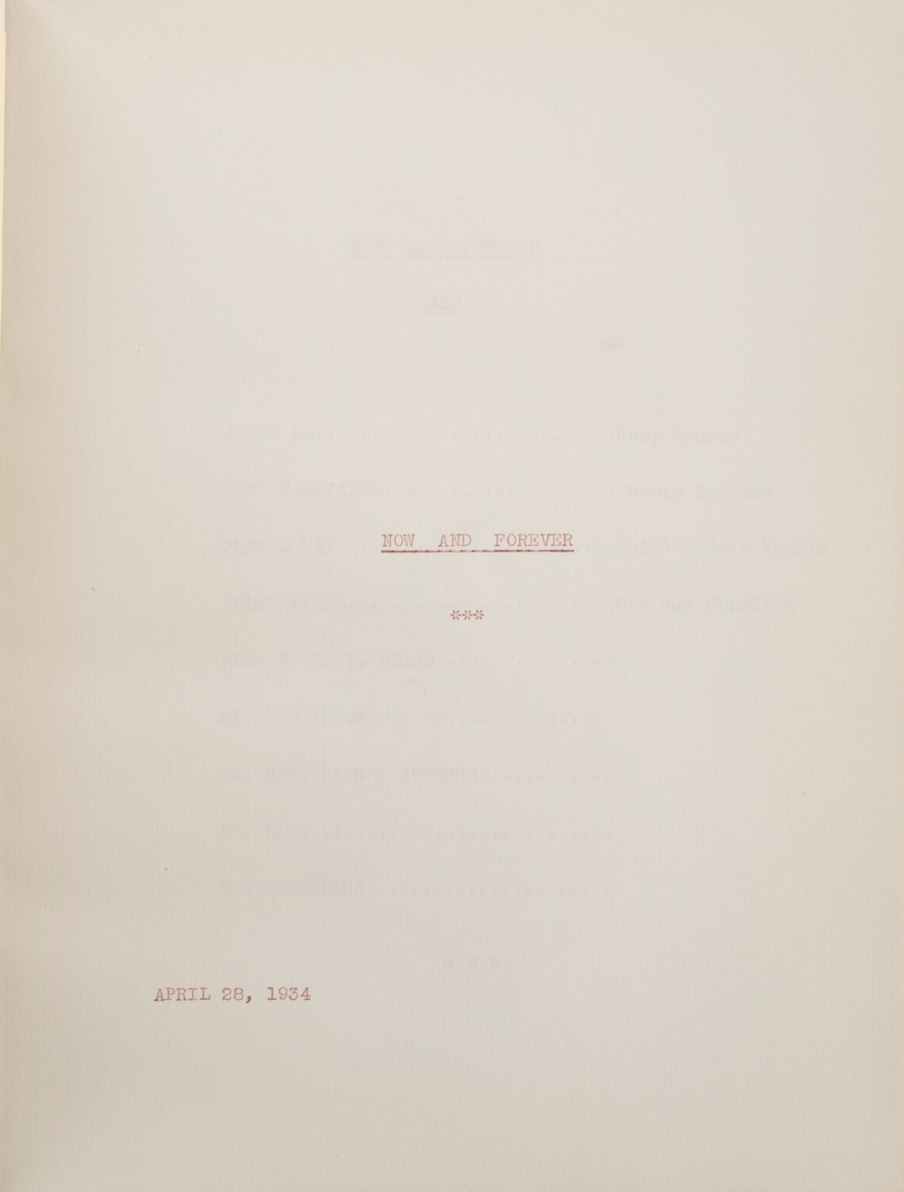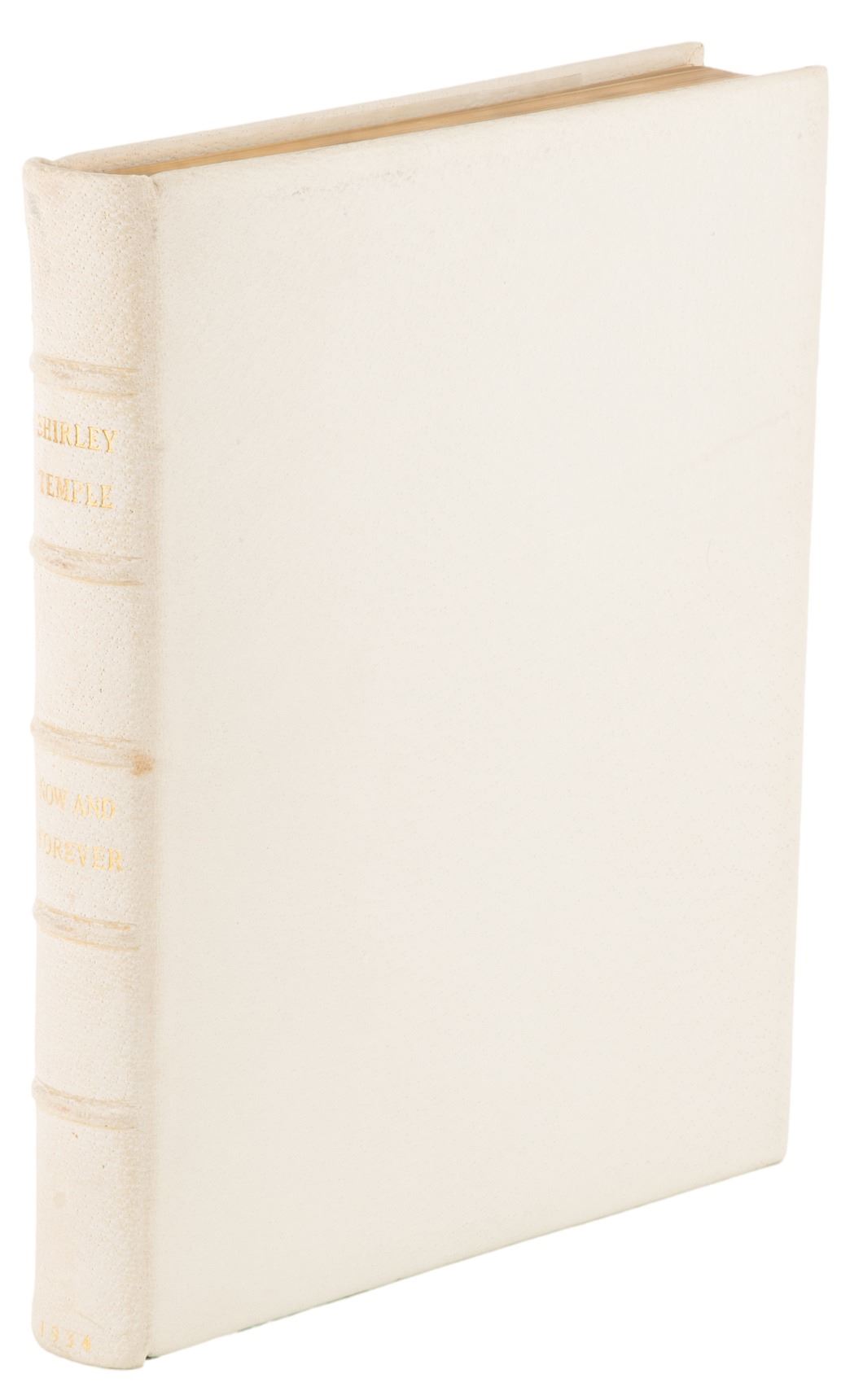41. Shirley Temple owned leather bound script from Now and Forever. (Paramount, 1956) Vintage original studio white leather and board bound 175+ page script written by Vincent Lawrence and Sylvia Thalberg from a story by Jack Kirkland and Melville Baker. Featuring hand painted watercolor of top hats and flashlights on back and front paste down and fly leafs. Also includes a vintage 8 x 10 in. sepia publicity photograph on double-weight paper tipped to the interior free page facing title page and featuring the film's stars Carole Lombard, Shirley Temple and Gary Cooper. Stamped with gold gilt lettering on the spine, "Shirley Temple, Now and Forever". Exhibiting minor age and handling. Comes with a COA signed by Charles Black Jr. for the Shirley Temple Black Family's Partnership. $2,000 - $3,000
