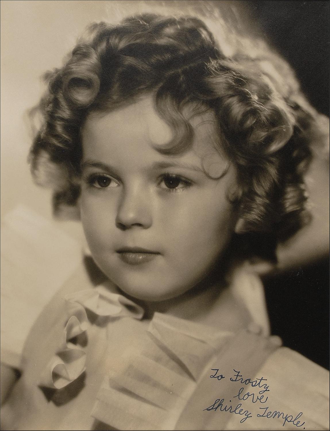 Adorable vintage matte-finish 10.5 x 13.5 photo, signed and inscribed in fountain pen as a child “To Frosty, Love, Shirley Temple.” In fine condition, with lightly trimmed edges, as well as some scattered light edge silvering. An exceptional image and signature, uncommon in oversized photos.