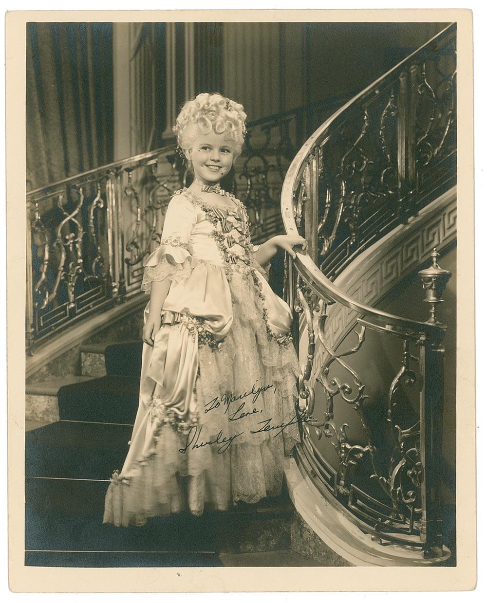 Vintage matte-finish 8 x 10 photo of the young actress standing on a staircase, signed and inscribed in fountain pen “To Marilyn, Love, Shirley Temple.” In fine condition, with corner bumps and silvering to some of the darker areas.