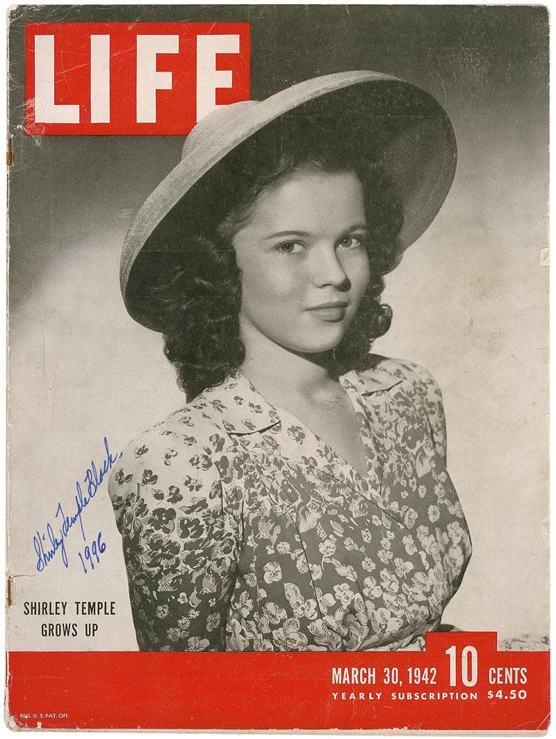 LIFE magazine, March 30, 1942, picturing a grown-up Shirley Temple signed on the front cover in blue felt tip “Shirley Temple Black 1996.” In very good condition, with mild surface wear, soiling, and rust stains near the staples.