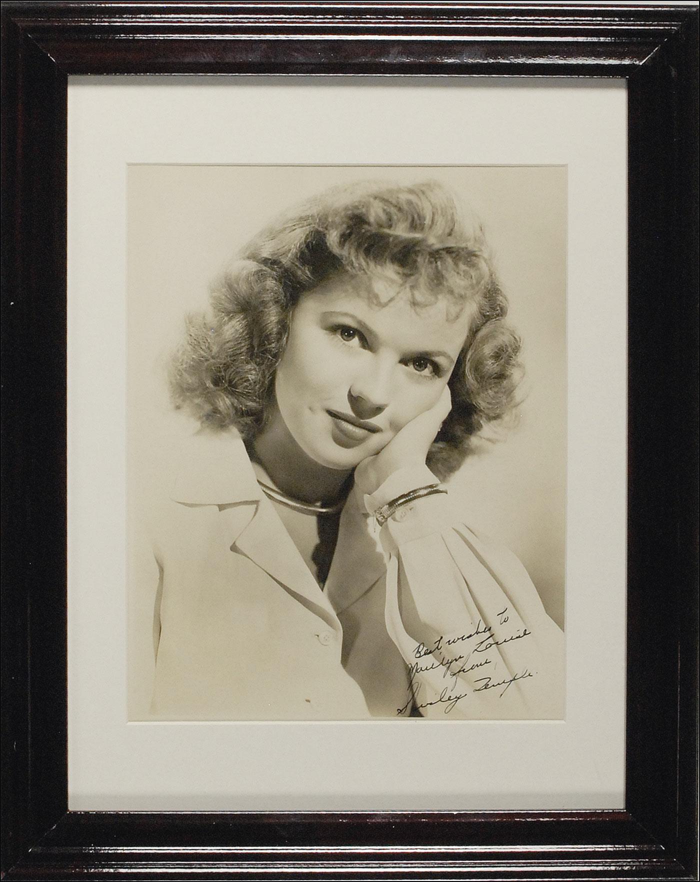Vintage matte-finish 7.5 x 9.25 photo of the adorable actress, signed and inscribed in fountain pen “Best Wishes to Marilyn Louise from Shirley Temple.” Matted and framed to an overall size of 12 x 15. In fine condition.