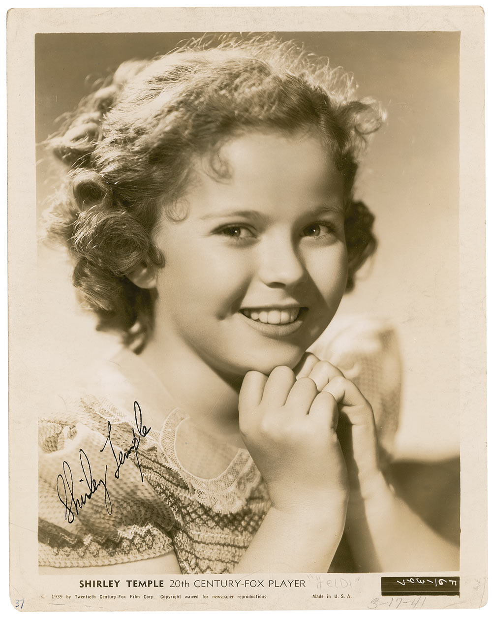 Vintage satin-finish 8 x 10 20th Century Fox publicity photo from Heidi, signed in black ink “Shirley Temple.” A couple of light creases and bends, scattered scuffing to the emulsion, and few pencil notations at the bottom white border, otherwise fine condition.