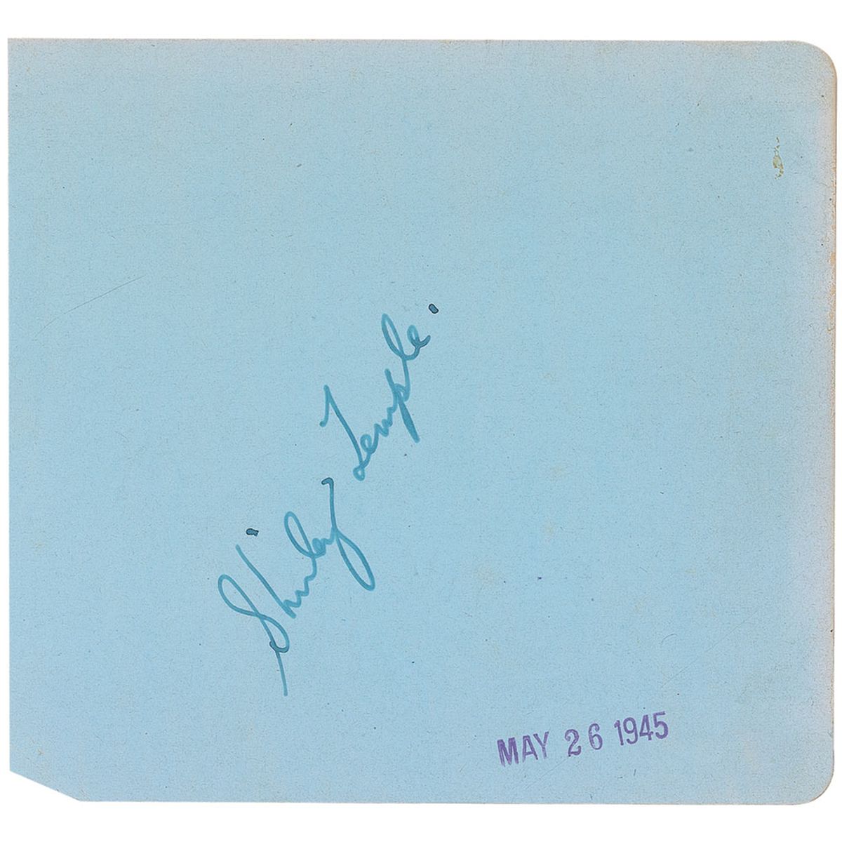 Vintage fountain pen teenage signature, “Shirley Temple,” on a light blue 5 x 4.5 album page, stamp-dated May 26, 1945. In fine condition, with some scattered light creases and wrinkles.
