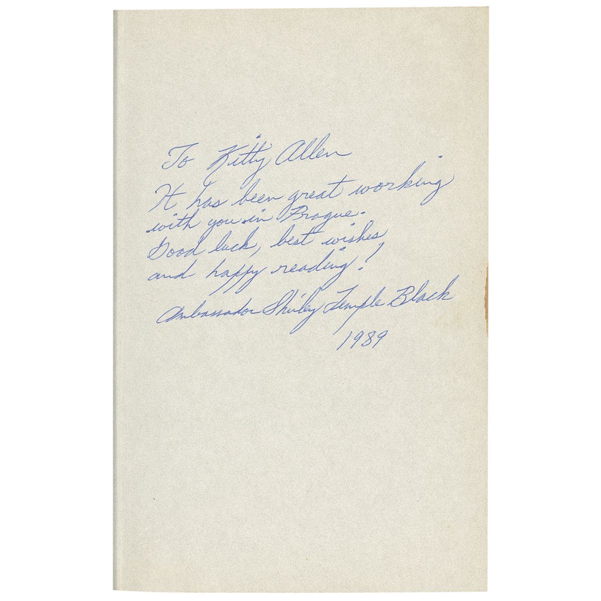 Signed book: Child Star: An Autobiography—Shirley Temple Black. 546 pages. NY: McGraw-Hill, 1988. Hardcover with dustjacket, 6.5 x 9.5. Signed and inscribed in blue ballpoint on the first free end page, “To Kitty Allen, It has been great working with you in Prague. Good luck, best wishes and happy reading! Ambassador Shirley Temple Black, 1989.” In very good condition, with some light soiling at the right edge of the signature page, only lightly affecting the last letter of the signature, uniform toning throughout, foxing to the fore-edges, a central vertical crease and light toning and rubbing to the dustjacket, and a price clip.