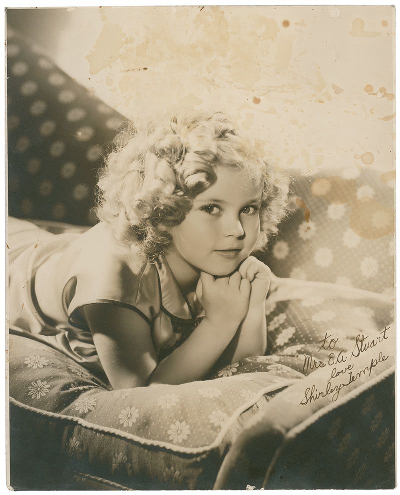 Vintage matte-finish 10.75 x 13.25 photo of a young Temple lying on a couch, signed and inscribed in fountain pen, as a child, “To Mrs. E. A. Stuary, love, Shirley Temple.” Photo is affixed to an identical size board. In good condition, with moderate staining to upper portion, mainly to the background, silvering to lower portion, a few small creases and spots of surface loss, and trimmed edges.