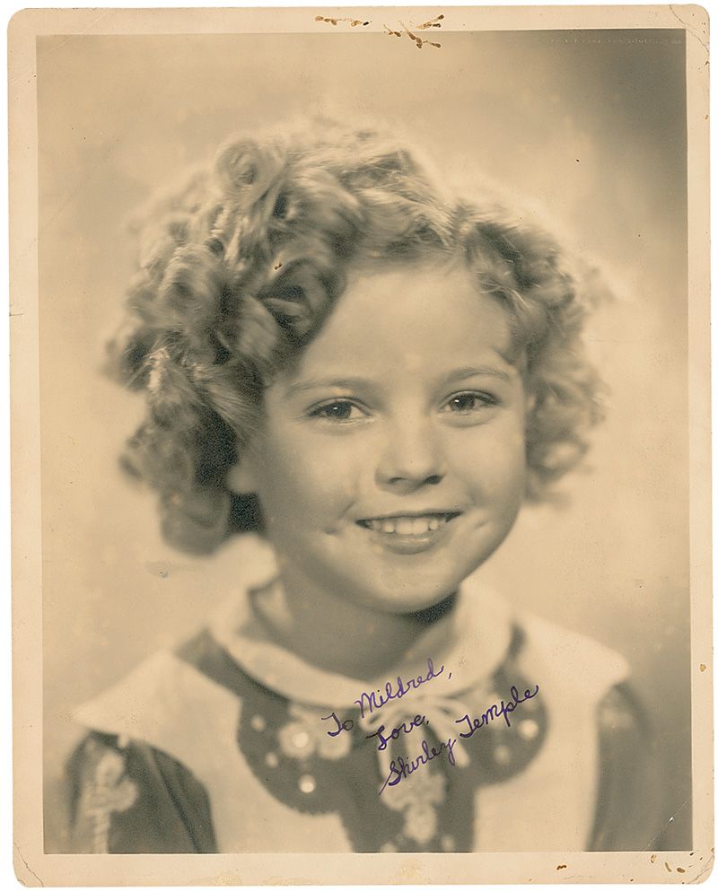 Adorable vintage matte-finish 8 x 10 photo, signed and inscribed in purple fountain pen as a child, “To Mildred, Love, Shirley Temple.” In very good condition, with corner and edge creases, some light adhesive stains to image, mounting remnants to reverse, and scattered soiling and spotting.