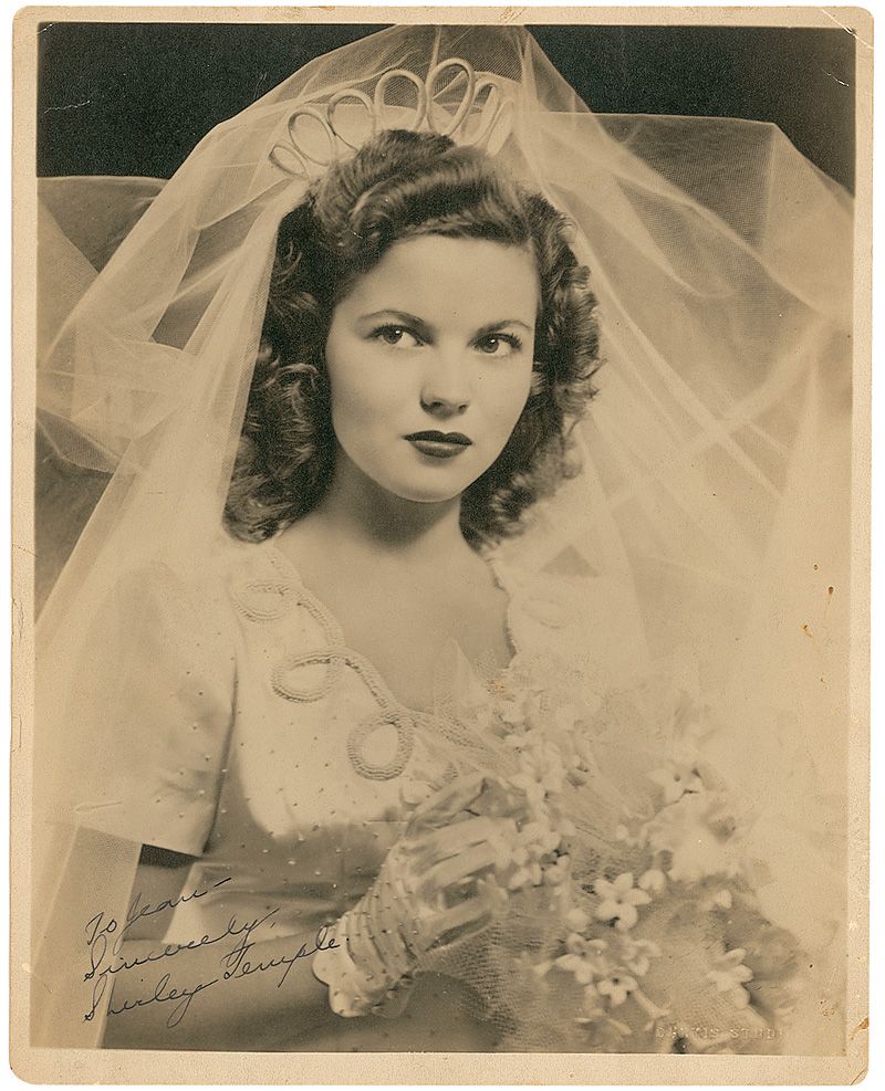 Vintage matte-finish 7.75 x 9.5 photo of Temple in her wedding gown, signed and inscribed in black ink “To Jean—Sincerely, Shirley Temple.” In very good condition, with diagonal crease to lower right, some other scattered light creases and surface marks, light soiling to borders, and a few spots to image.