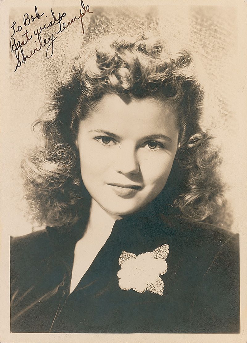 Vintage matte-finish 5 x 7 photo of Temple as a young woman, signed and inscribed in black ink “To Bob, Best wishes, Shirley Temple.” In fine condition, with some light corner tip creases and light silvering to darker areas of image.