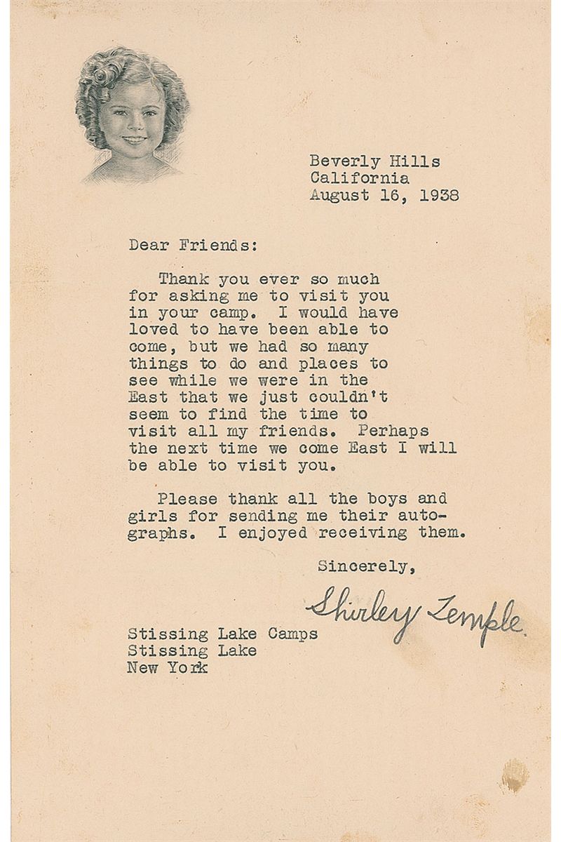 Early TLS, one page, 5.5 x 8.5, illustrated personal letterhead, Beverly Hills, August 16, 1938. Letter to Stissing Lake Camp in New York. In part: “Thank you ever so much for asking me to visit you in your camp…we had so many things to do and places to see while we were in the East that we just couldn’t seem to find the time to visit all my friends.” Scattered toning and soiling, otherwise fine condition.