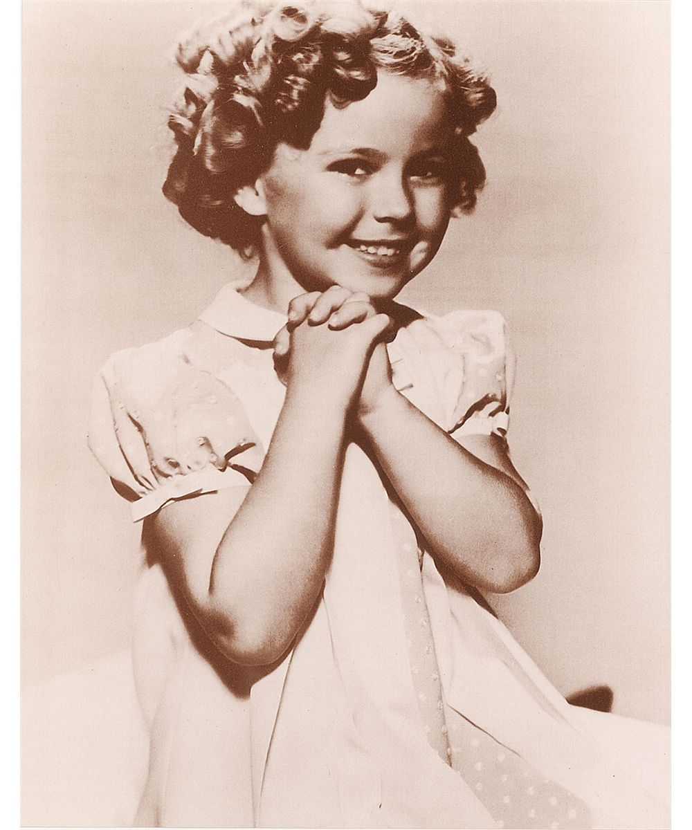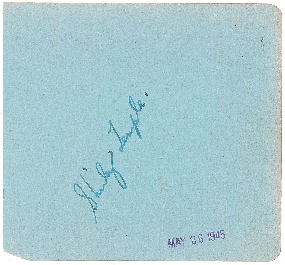 Vintage fountain pen signature, “Shirley Temple,” on a light blue 5 x 4.5 album page stamp-dated May 26, 1945. In fine condition. Accompanied by an unsigned 11 x 14 cardstock photo of Temple as a child.