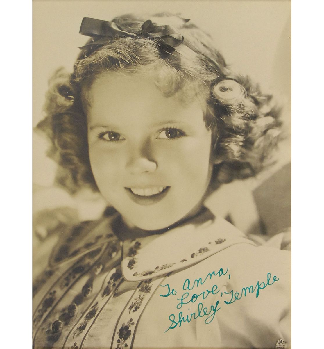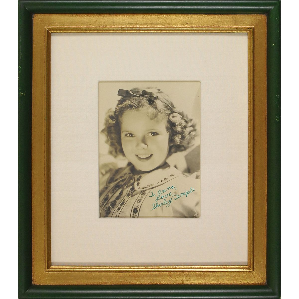 Adorable vintage matte-finish 4.5 x 6.5 20th Century Fox publicity photo, signed and inscribed in green fountain pen, as a child, “To Anna, Love, Shirley Temple.” Cloth-matted and framed to an overall size of 12 x 14. In fine condition.