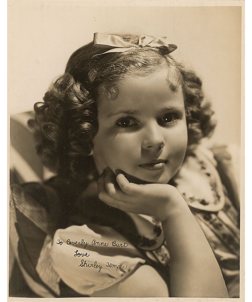 Superlative vintage glossy 11 x 14 portrait of Temple resting her chin on her hand, boldly signed and inscribed in fountain pen, “For Beverly Anne Burt, Love, Shirley Temple.” A few corner tip creases and tiny edge tears, and a surface ding near her hand, otherwise fine condition. A stunningly sharp image with the child star’s highly desirable early signature.
