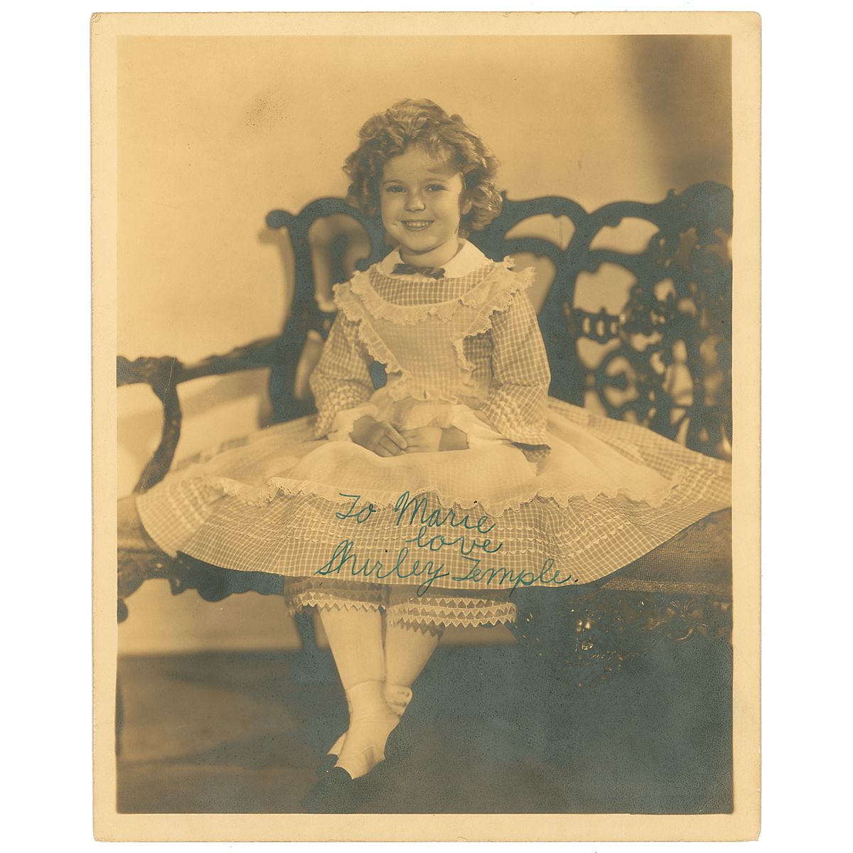 Vintage circa 1934 matte-finish 8 x 10 photo of Temple in an adorable checkered dress, signed and inscribed in fountain pen, “To Marie, love, Shirley Temple.” In fine condition, with some creasing to corners and edges, and moderate silvering to dark areas of the image.