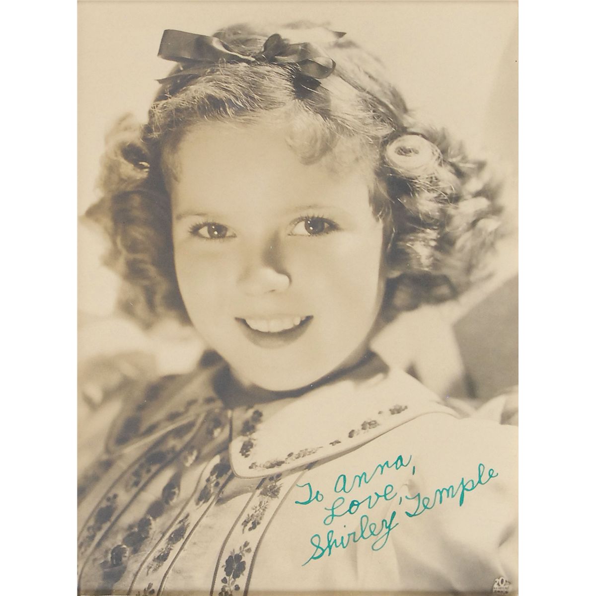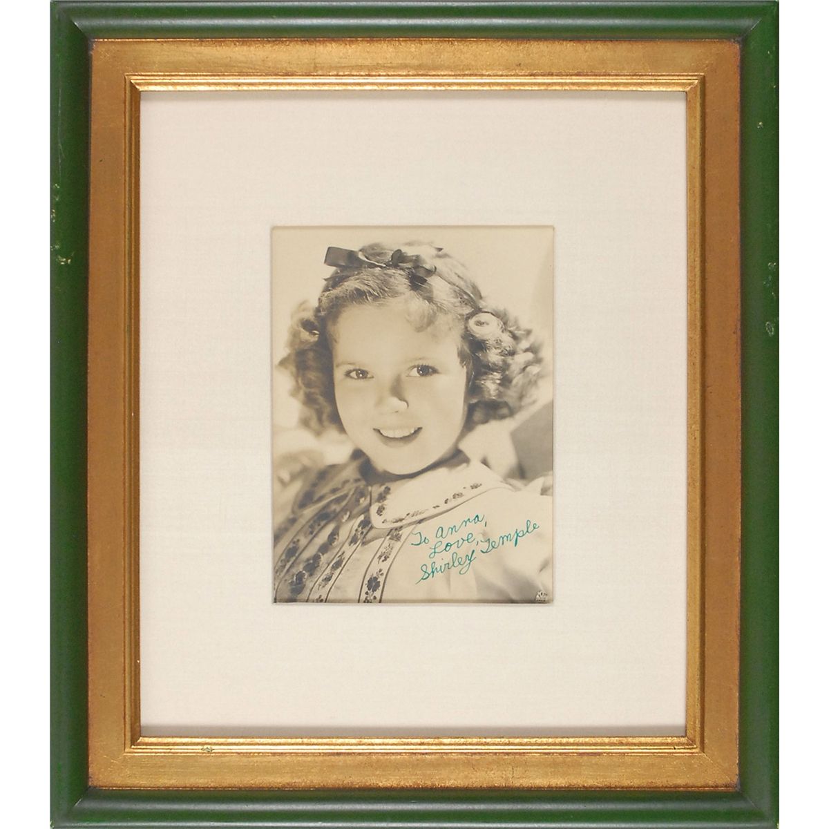 Adorable vintage matte-finish 4.5 x 6.5 20th Century Fox publicity photo, signed and inscribed in green fountain pen, as a child, “To Anna, Love, Shirley Temple.” Cloth-matted and framed to an overall size of 12 x 14. In fine condition.