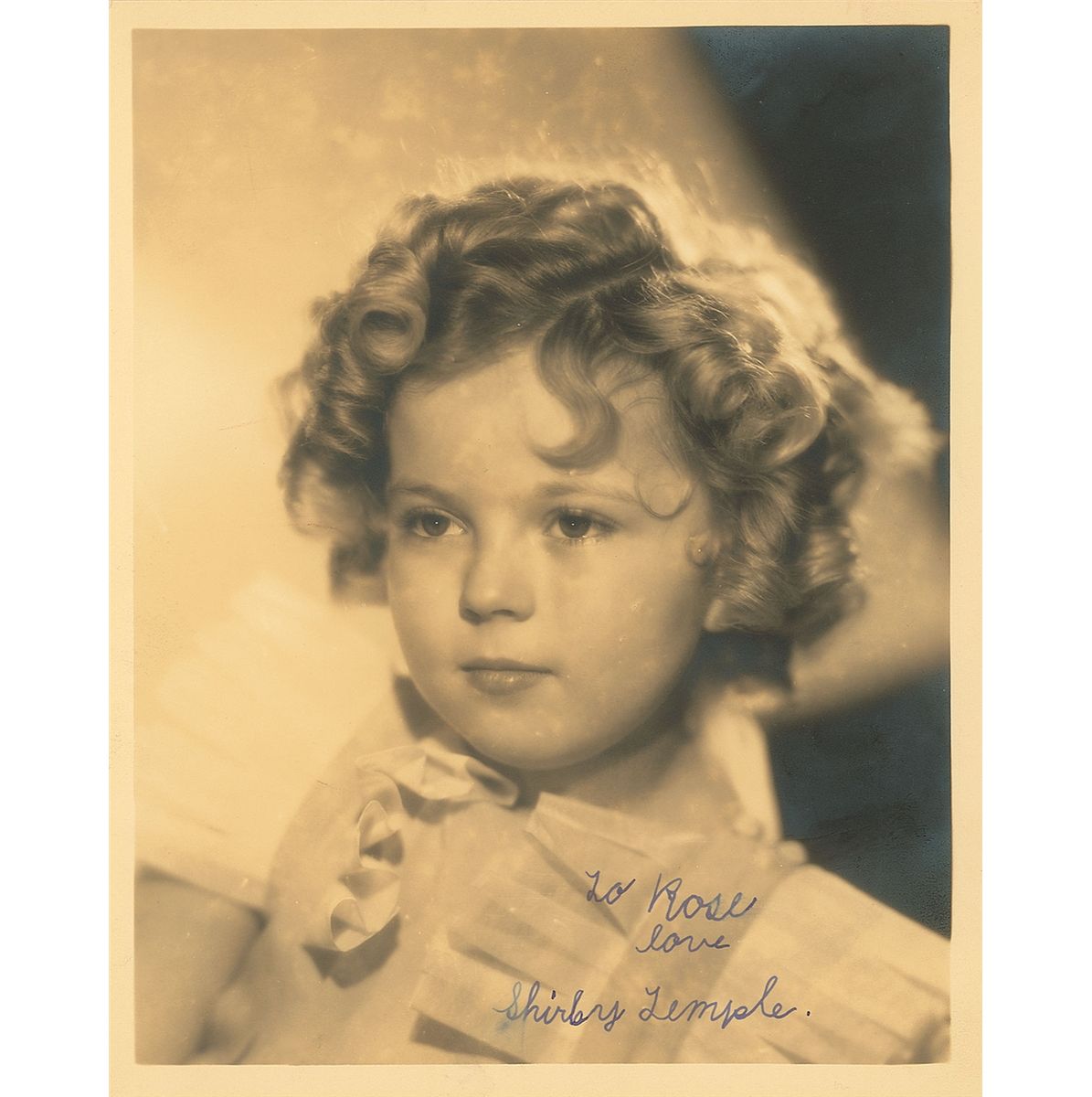 Vintage matte-finish 8 x 10 photo, signed and inscribed in fountain pen, as a child, “To Rose, love, Shirley Temple.” In very good condition, with a light brush to beginning of signature, some silvering to dark background, and scattered light spotting to background and image.