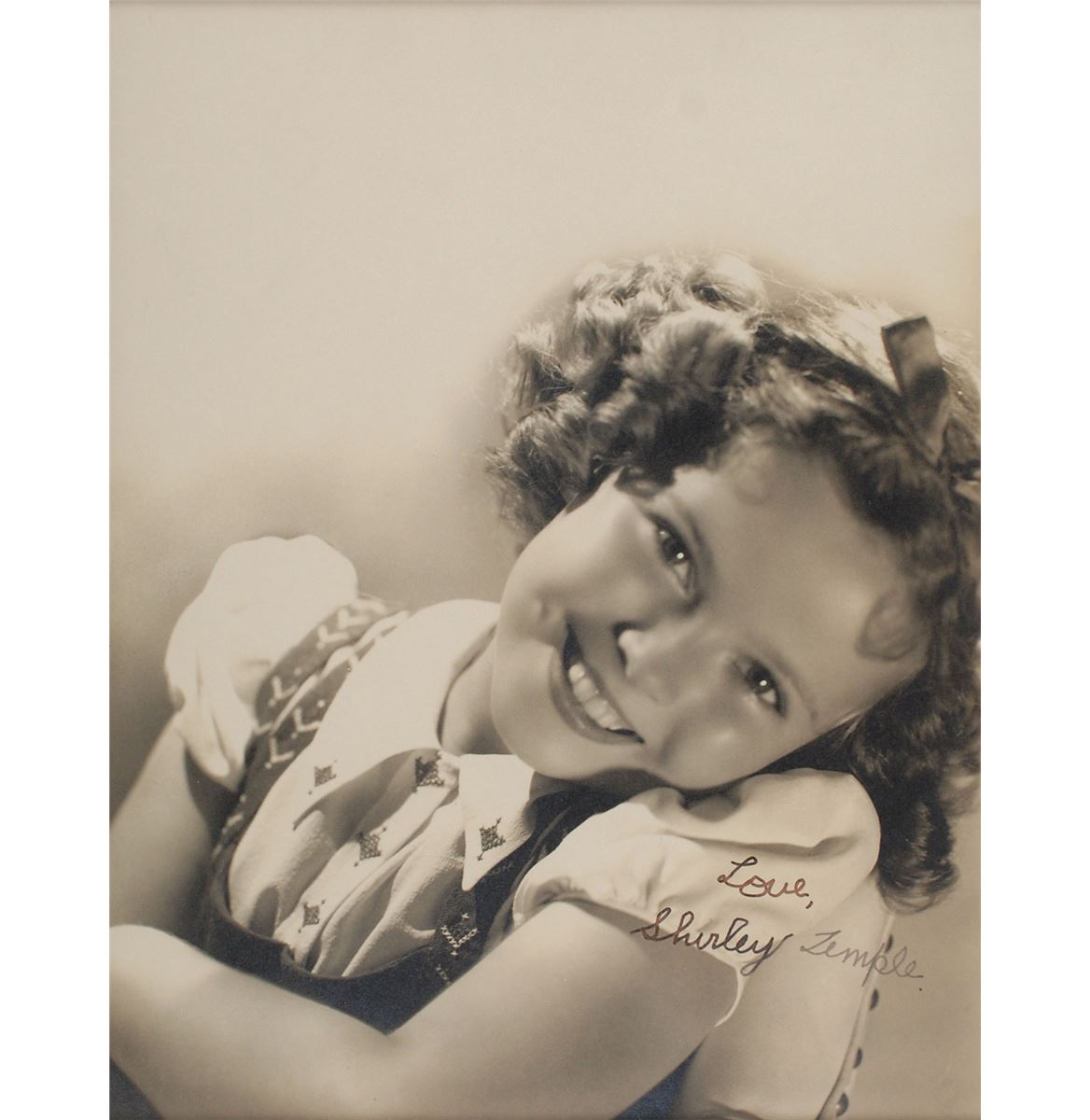 Adorable vintage matte-finish 7.25 x 9.25 photo of Temple leaning her head on her shoulder, signed in fountain pen, “Love, Shirley Temple.” Matted and framed to an overall size of 17 x 19. In fine condition, with her last name a shade light.