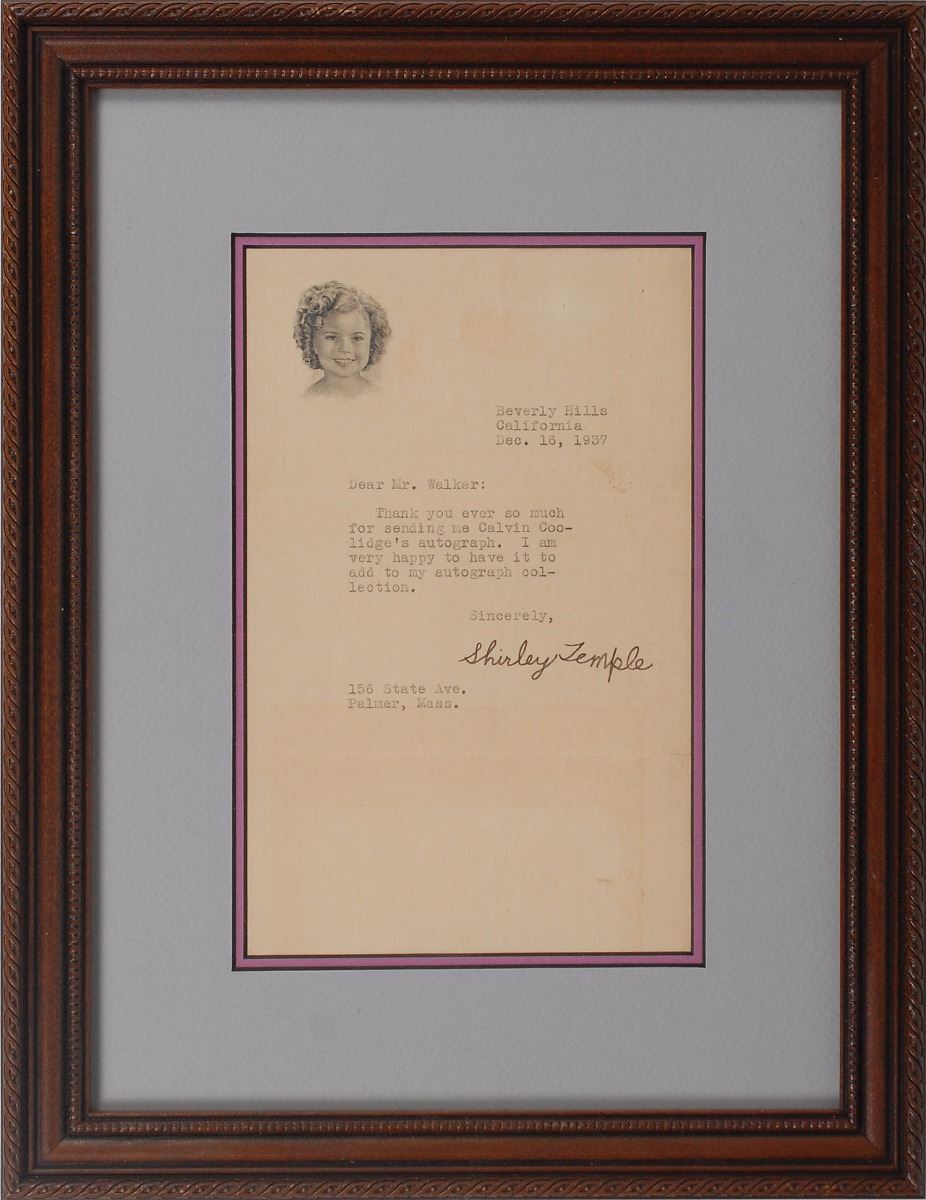 TLS, one page, 5 x 8, personal letterhead, December 16, 1937. Letter to Mr. Walker, in full: “Thank you ever so much for sending me Calvin Coolidge’s autograph. I am very happy to have it to add to my autograph collection.” Double-matted and framed to an overall size of 10.5 x 13.5. In fine condition, with a few areas of trivial soiling and a light irregular block of toning to lower portion.
