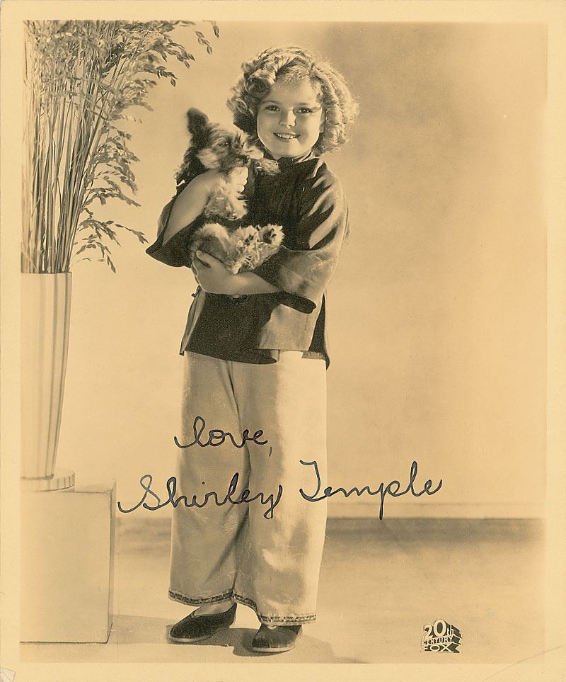 Adorable vintage matte-finish 5 x 7 20th Century Fox publicity photo of the curly haired child actress holding a puppy, boldly signed in fountain pen during her childhood, "Love, Shirley Temple." In fine condition.