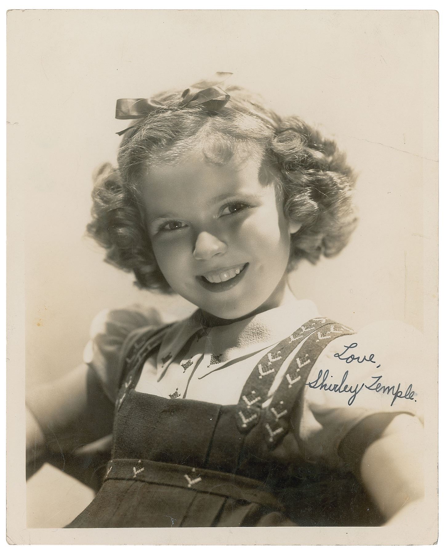 Wonderful vintage glossy 8 x 10 photo of the legendary child actress in a cute head-and-shoulders pose, signed in fountain pen as a child, "Love, Shirley Temple." In very good condition, with light silvering to the darker areas of the image, and overall creases, one of which touches her chin.