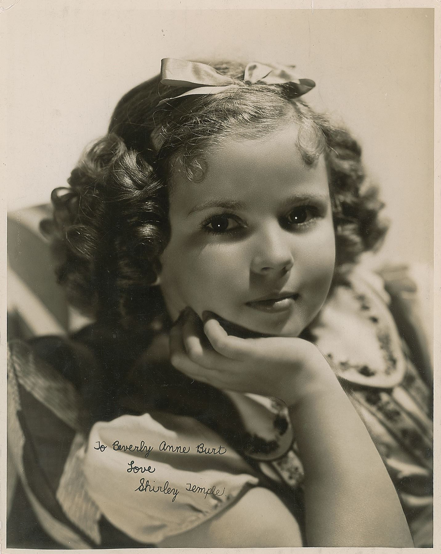 Vintage glossy 11 x 14 close-up photo of the adorable child actress, signed and inscribed in bold fountain pen, "To Beverly Anne Burt, Love, Shirley Temple.” In fine condition, with a small ding to the emulsion under her hand.