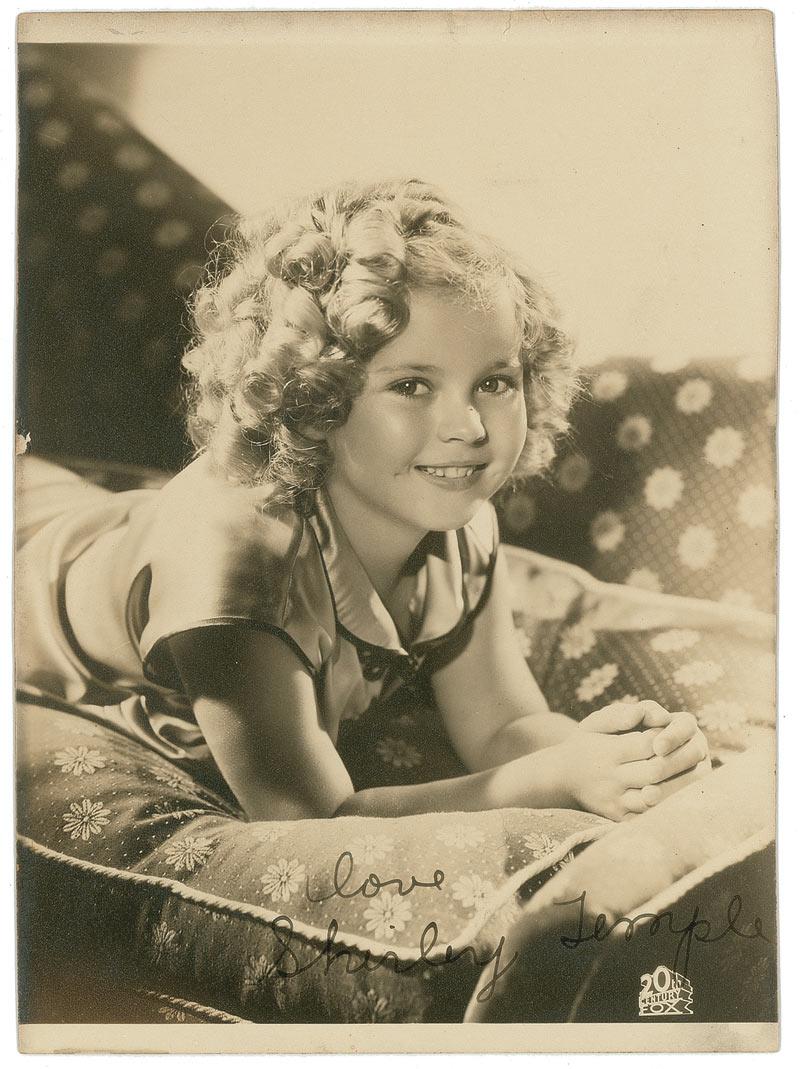 Cute vintage matte-finish 5 x 7 20th Century Fox publicity photo, signed in fountain pen, as a child, “love, Shirley Temple.” Trimmed edges, a few light edge tears, and some light contrast to portions of signature, otherwise fine condition.