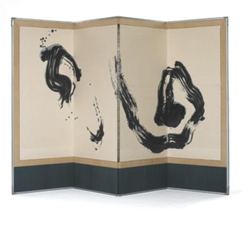 Shiryu Morita folding screen Japan, 1967 ink, paper, silk, aluminum 92"w x 72"h Morita is an artist who combines the history of Asian calligraphy and the development of Abstract Expressionism in the West. His artworks transcend the barriers between cultures, which produced a new and unique international art. Applied paper label to reverse with ink signature, title, and official seal authenticity in Japanese.