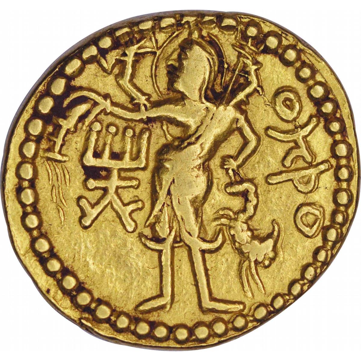 Kushan Dynasty, Huvishka (160-190 AD), Gold Dinar, OESHO (Shiva) Type, Obv: king seated to left holding a mace and bactrian legend aroundþAONANOþAO OOηþKI KOþANO(King of Kings Huvishka Kushan),Rev: four armed lord shiva standing facing towards left,in which are vase, goad, thunderbolt/trident, ankush (damru) and a standing goat withbactrian legend at rightOESHO andtamgha at left, surround by a border of dots, 7.85g, 20.42mm, (Gobl # 37), about extremely fine, complete details,Extremely Rare.