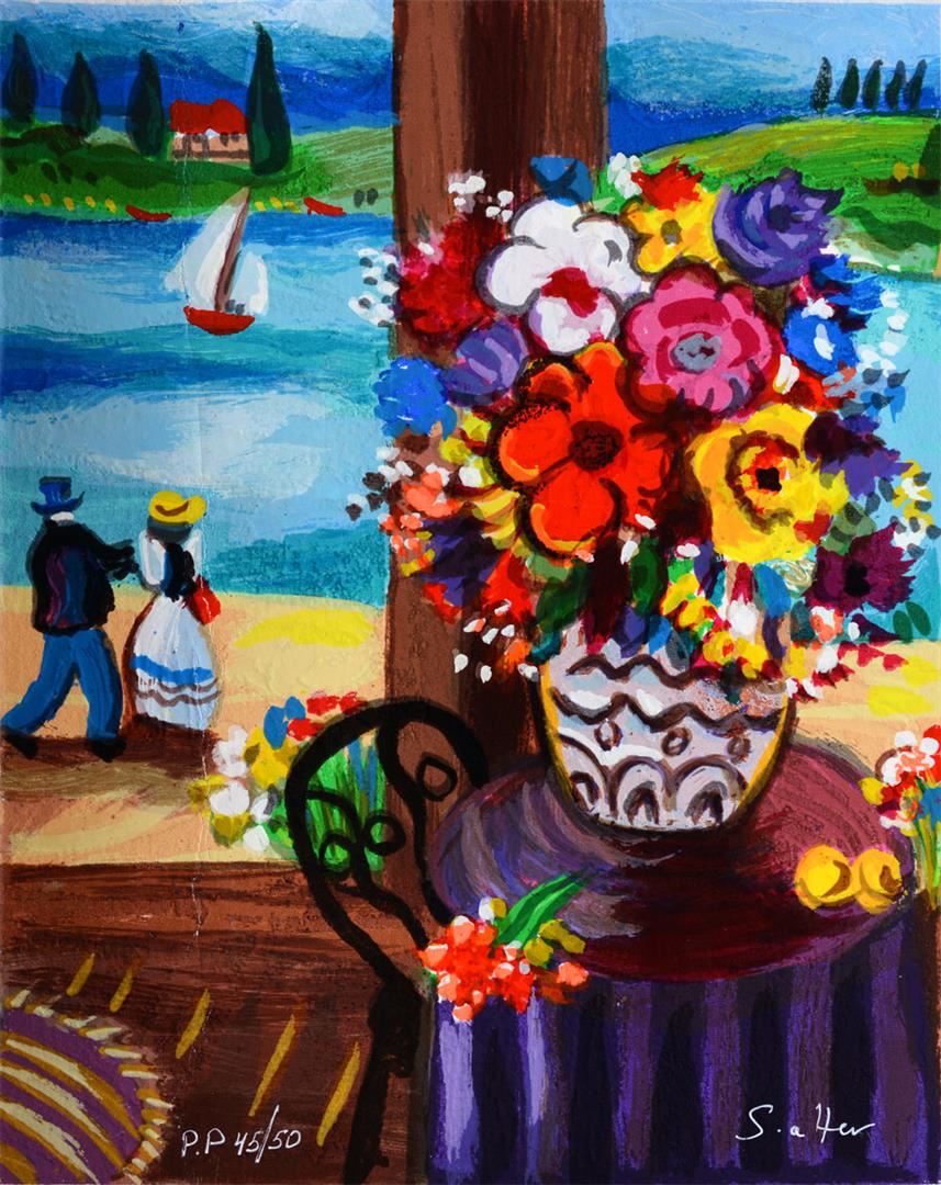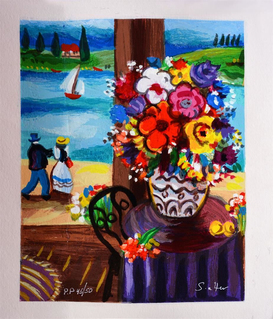 Artist: Shlomo Alter - Title: A Walk by the Lake - Medium: Serigraph on Fine Art Paper - Signature: Hand-signed by the Artist - Limited Edition: PP 50 - Paper Size: Approximately 10.5 inches x 8.5 inches - Unframed - Details: This work comes with a Certificate of Authenticity - Biography: Shlomo Alter was born in Romania to a family of restaurateurs. He emigrated to Israel in 1948 and during high school he started to study painting under the well known artist Aaron Avni. Some of his early works appeared in UNICEF'S world touring exhibition of young artists. Altar's works are influenced by his early recollections of the well dressed people who gathered in the courtyard of his parent's restaurant in Bucharest to eat and drink, to dance of Gypsy bands, and to enjoy the convivial atmosphere. With a touch of optimism and good humor Alter's art reflects life at its core, an antithesis to the Nazi regime that shattered his childhood happiness. His paintings are like stage set on which the objects relate to each other through a glow of colors and lines - a frozen moment in time, a dynamic stillness prior to a burst of action. His style can best be compared to that of the Expressionists. He uses color to give direct expression to his ideas in influence by the famous, particularly Matisse and Duty.