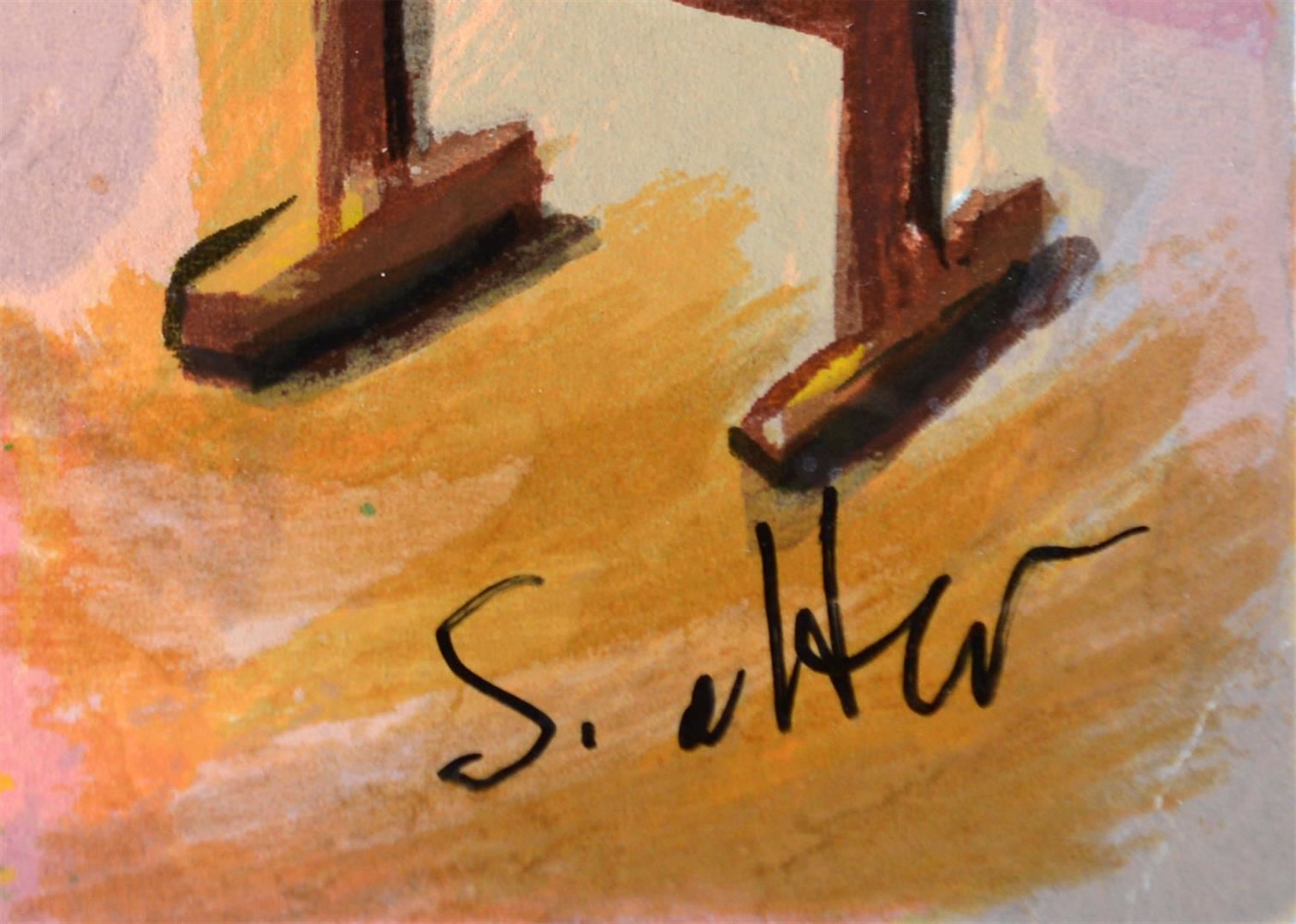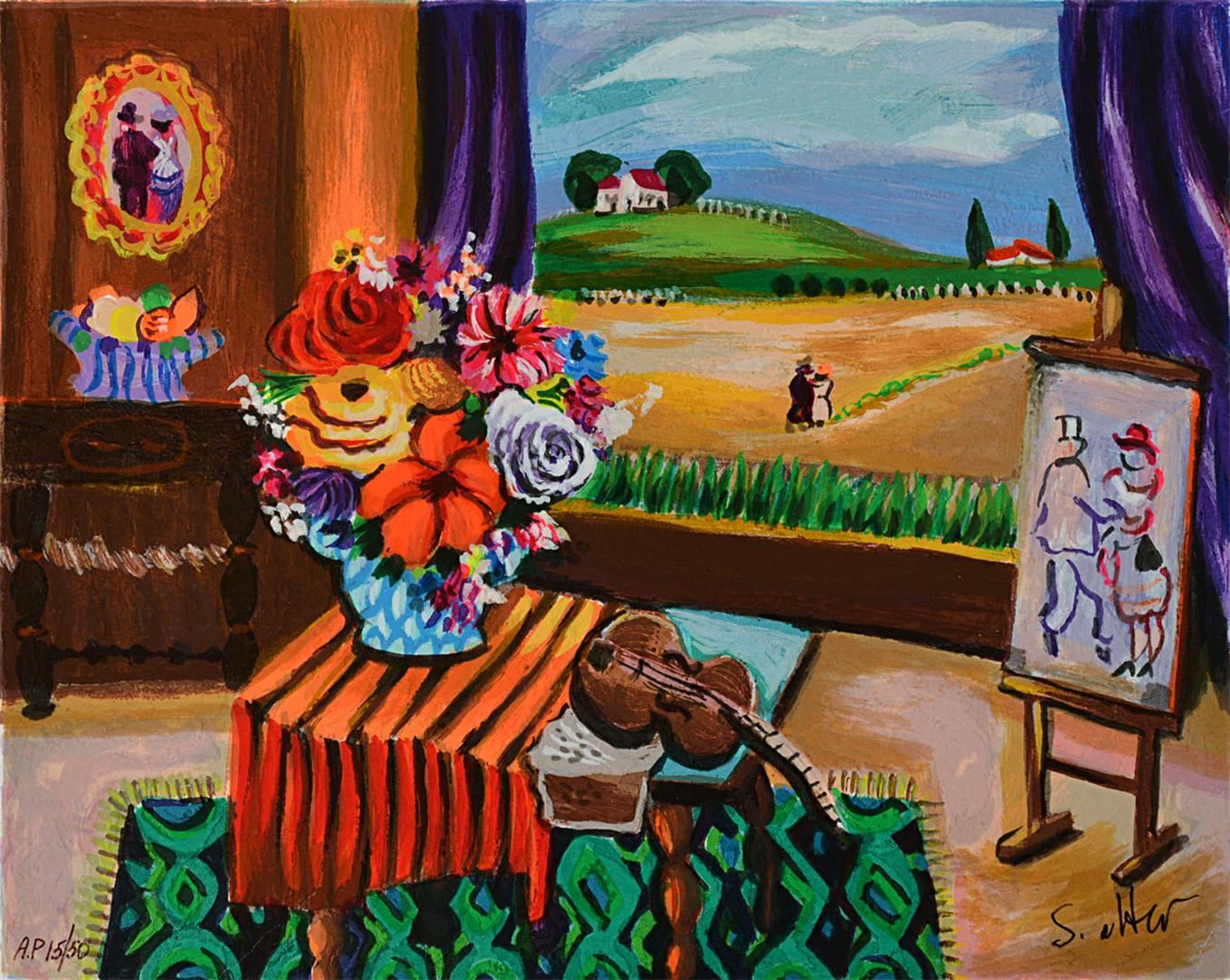 Artist: Shlomo Alter - Title: Artists Studio - Medium: Serigraph on Fine Art Paper - Signature: Hand-signed by the Artist - Limited Edition: AP50 - Paper Size: Approximately 9 inches x 11.5 inches - Framed: Unframed - Details: This work comes with a Certificate of Authenticity - Biography: Shlomo Alter was born in Romania to a family of restaurateurs. He emigrated to Israel in 1948 and during high school he started to study painting under the well known artist Aaron Avni. Some of his early works appeared in UNICEF'S world touring exhibition of young artists. Altar's works are influenced by his early recollections of the well dressed people who gathered in the courtyard of his parent's restaurant in Bucharest to eat and drink, to dance of Gypsy bands, and to enjoy the convivial atmosphere. With a touch of optimism and good humor Alter's art reflects life at its core, an antithesis to the Nazi regime that shattered his childhood happiness. His paintings are like stage set on which the objects relate to each other through a glow of colors and lines - a frozen moment in time, a dynamic stillness prior to a burst of action. His style can best be compared to that of the Expressionists. He uses color to give direct expression to his ideas in influence by the famous, particularly Matisse and Duty.